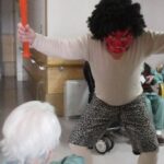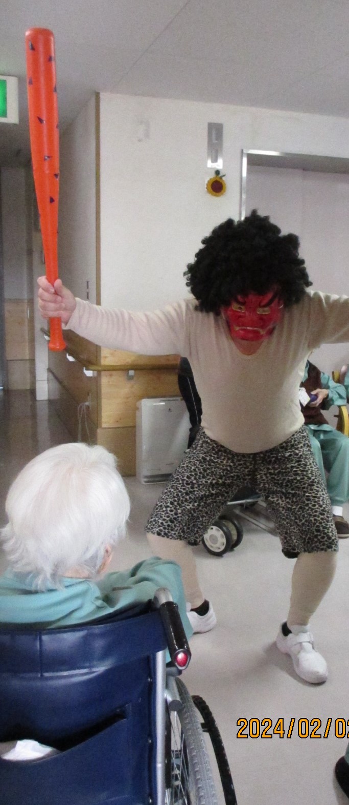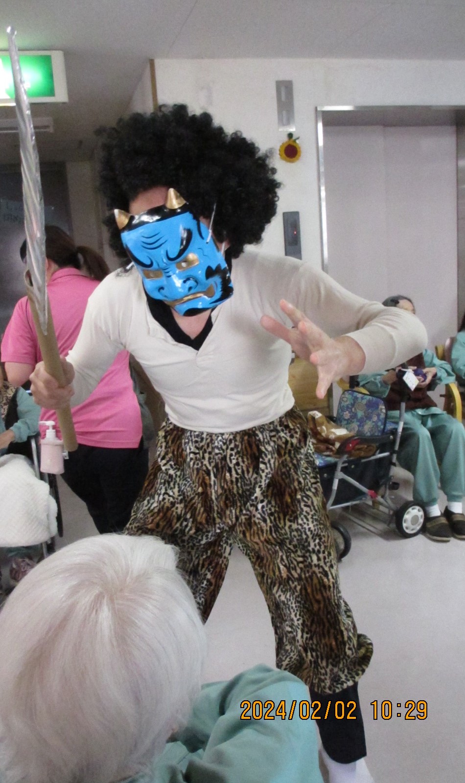 青が師長鬼・赤が師長鬼です。鬼の迫力に負けず利用者さん笑顔で豆まきしました。