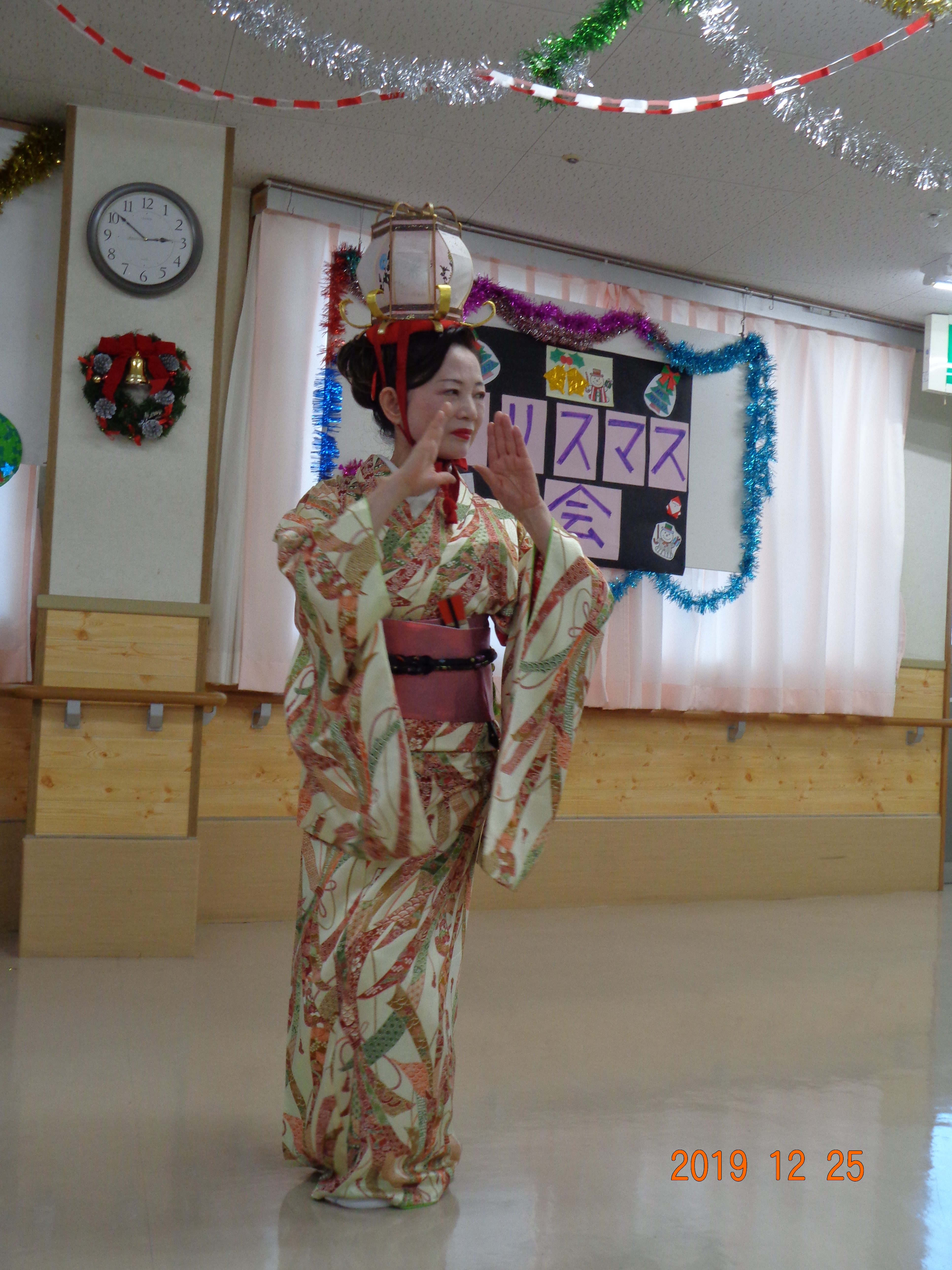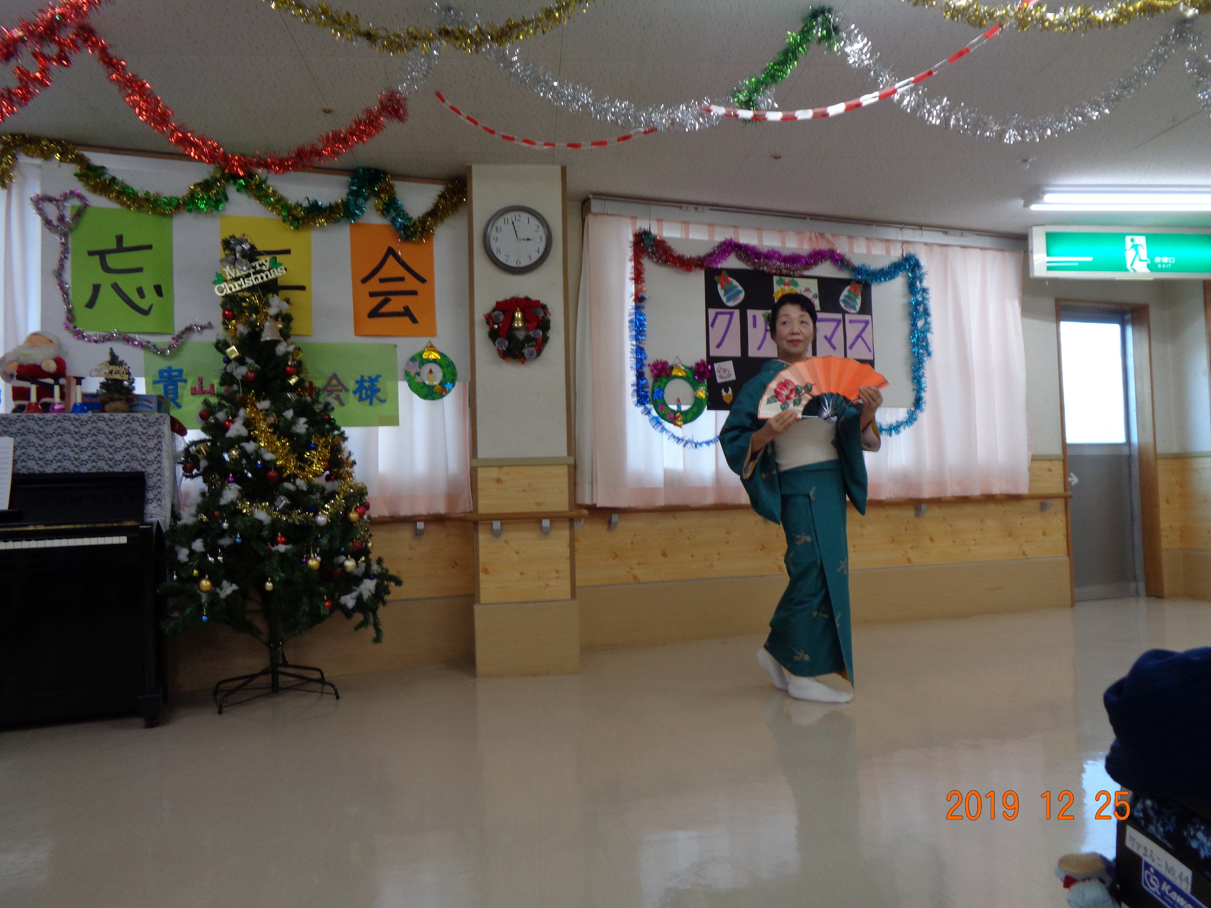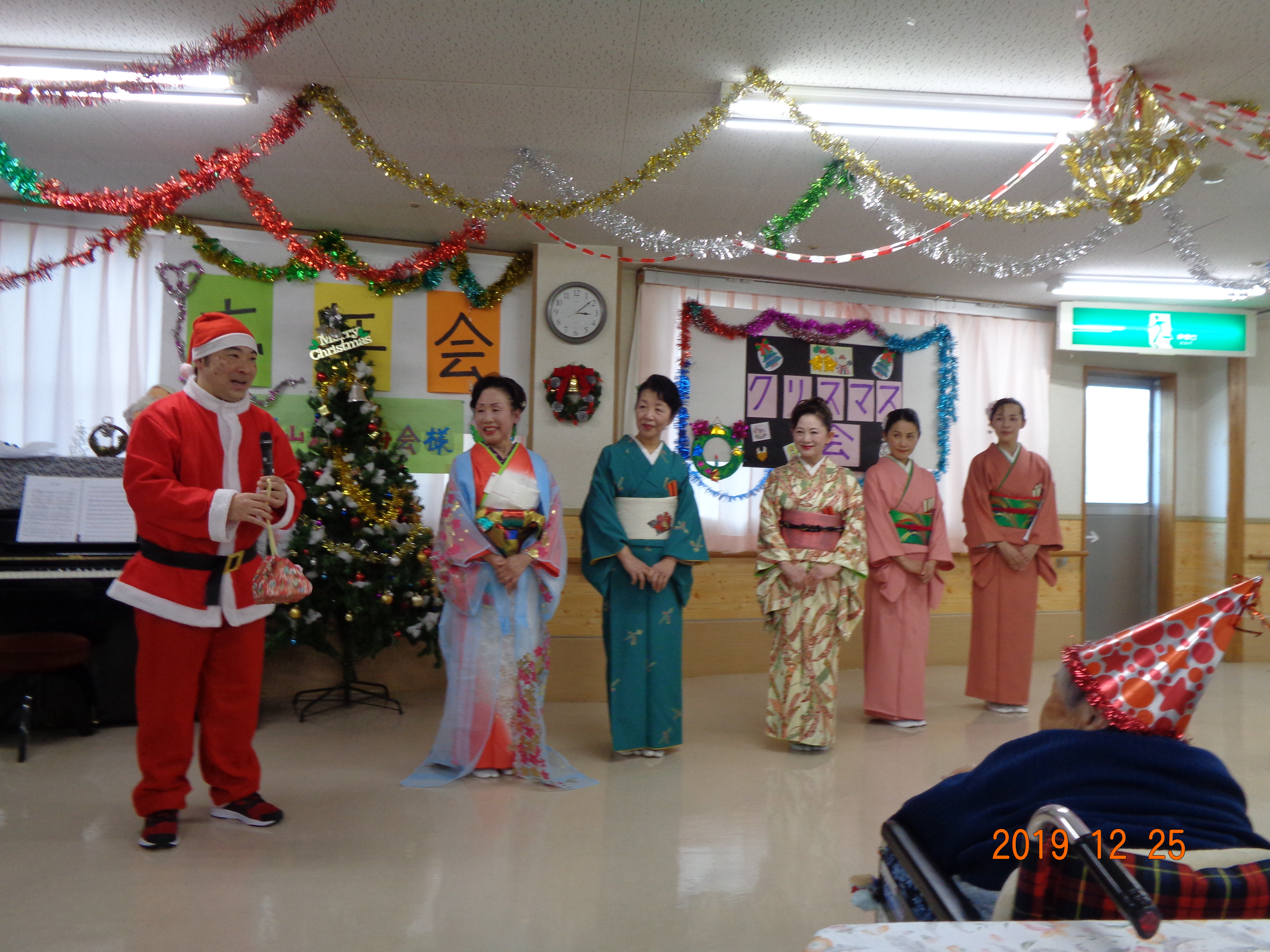 入所ではサンタクロースも登場しクリスマスプレゼントは利用者さんに好評でした。 ボランティアの貴山観桜み会さんの日本舞踊はとても素晴らしかったです。 デイケアは職員の余興でラインダンスをしたり、デュエットで二輪草を歌いました。利用者さんも余興体操をしてくださり楽しい時間を過ごせました。