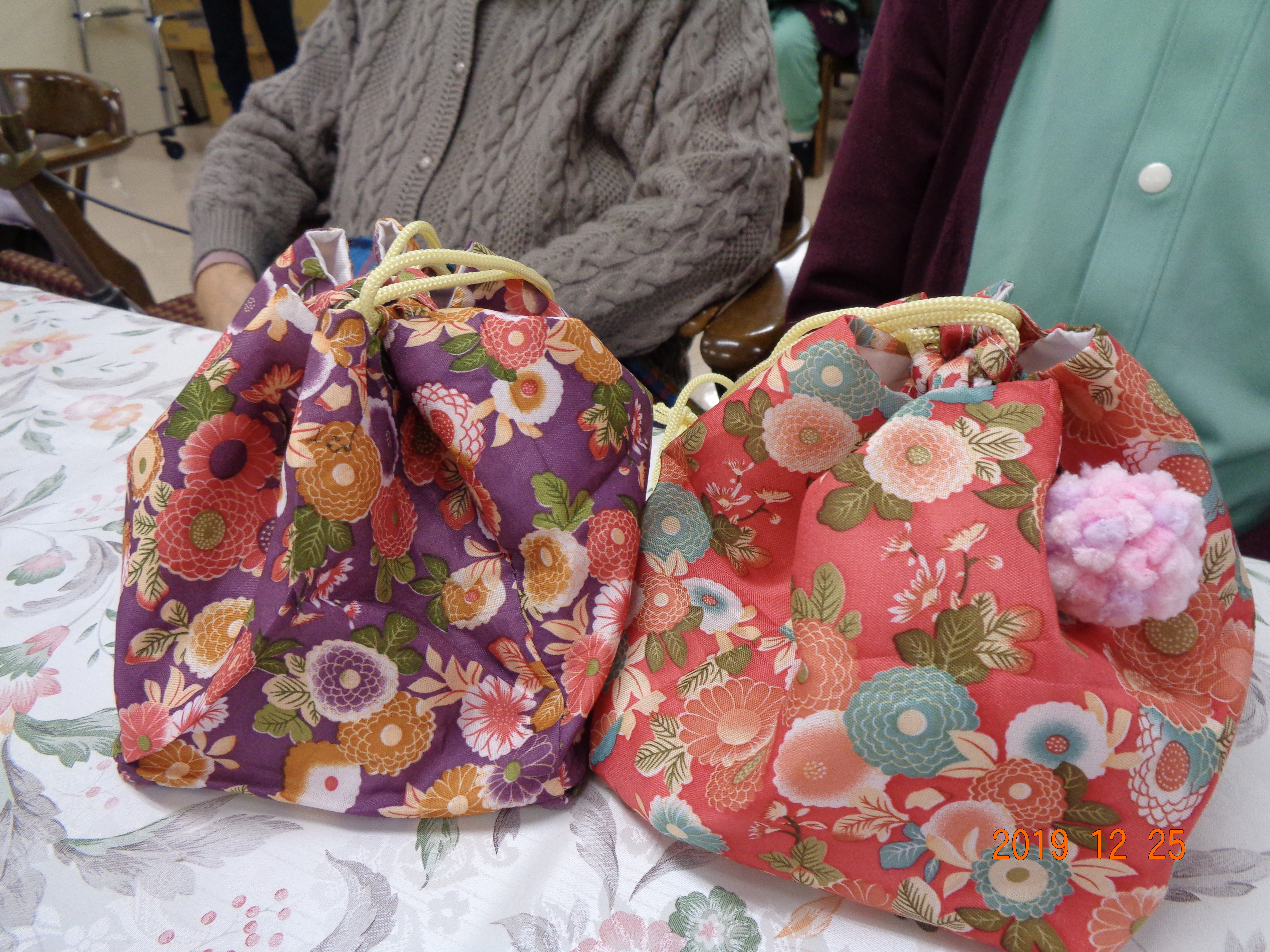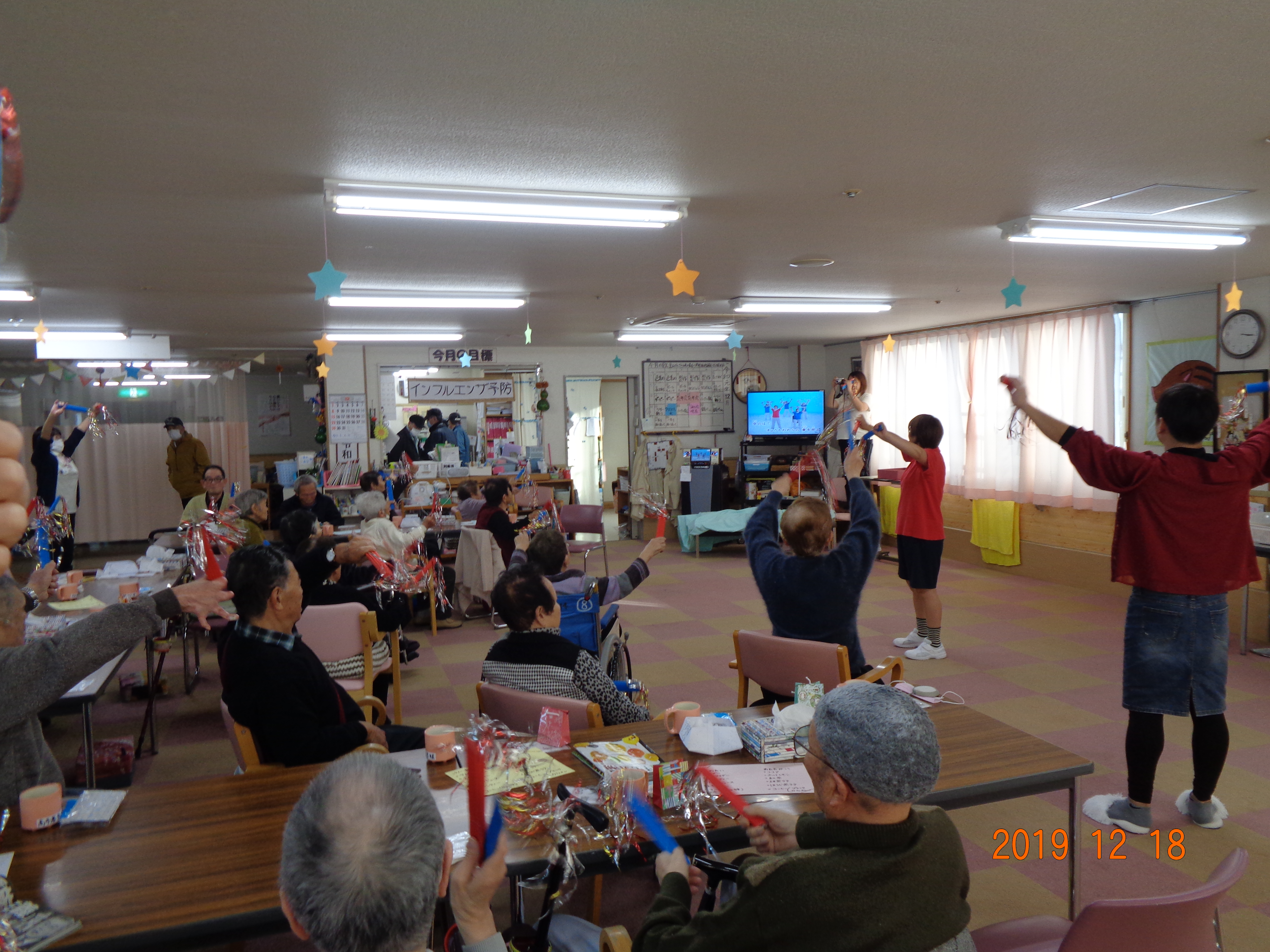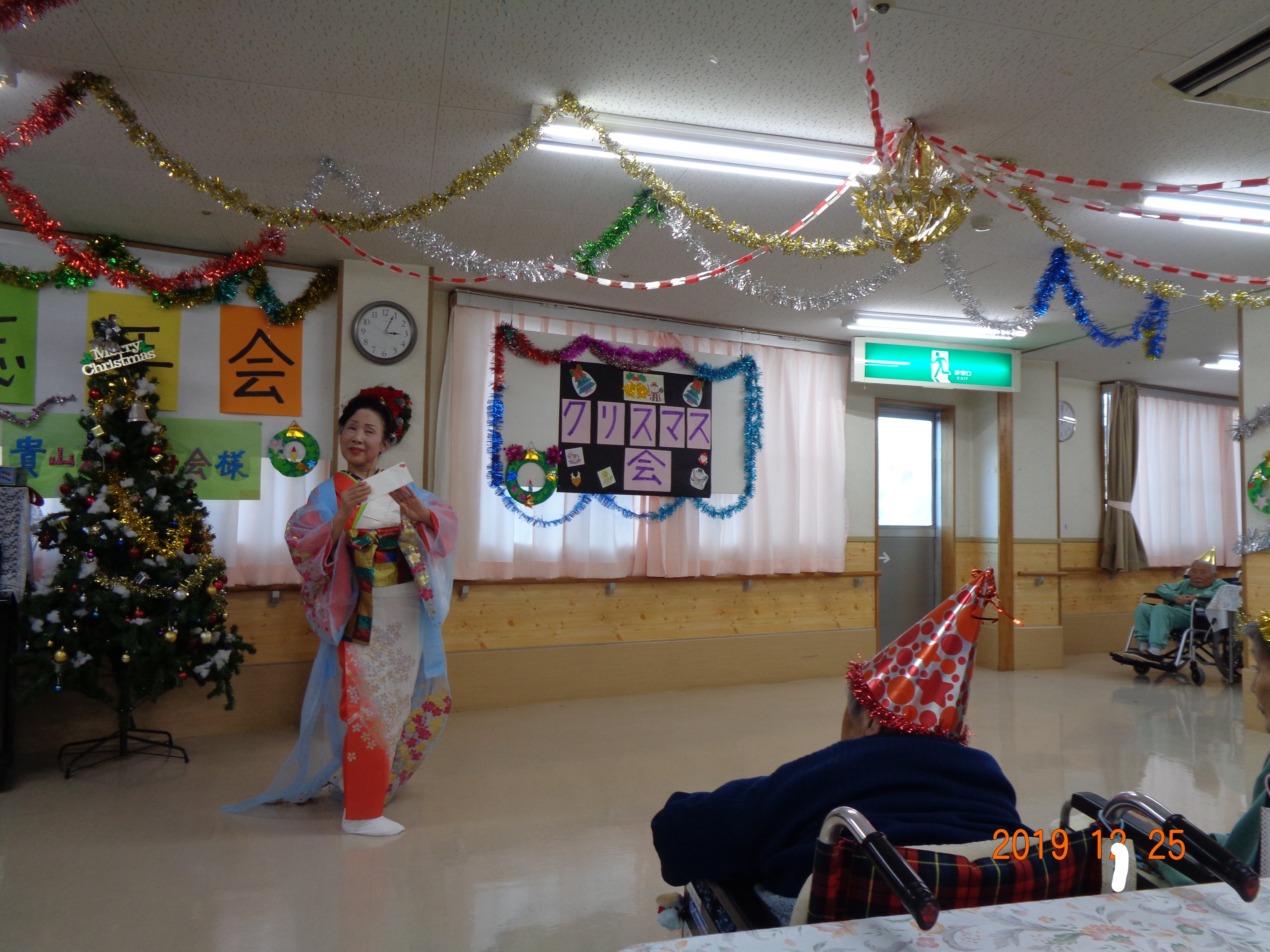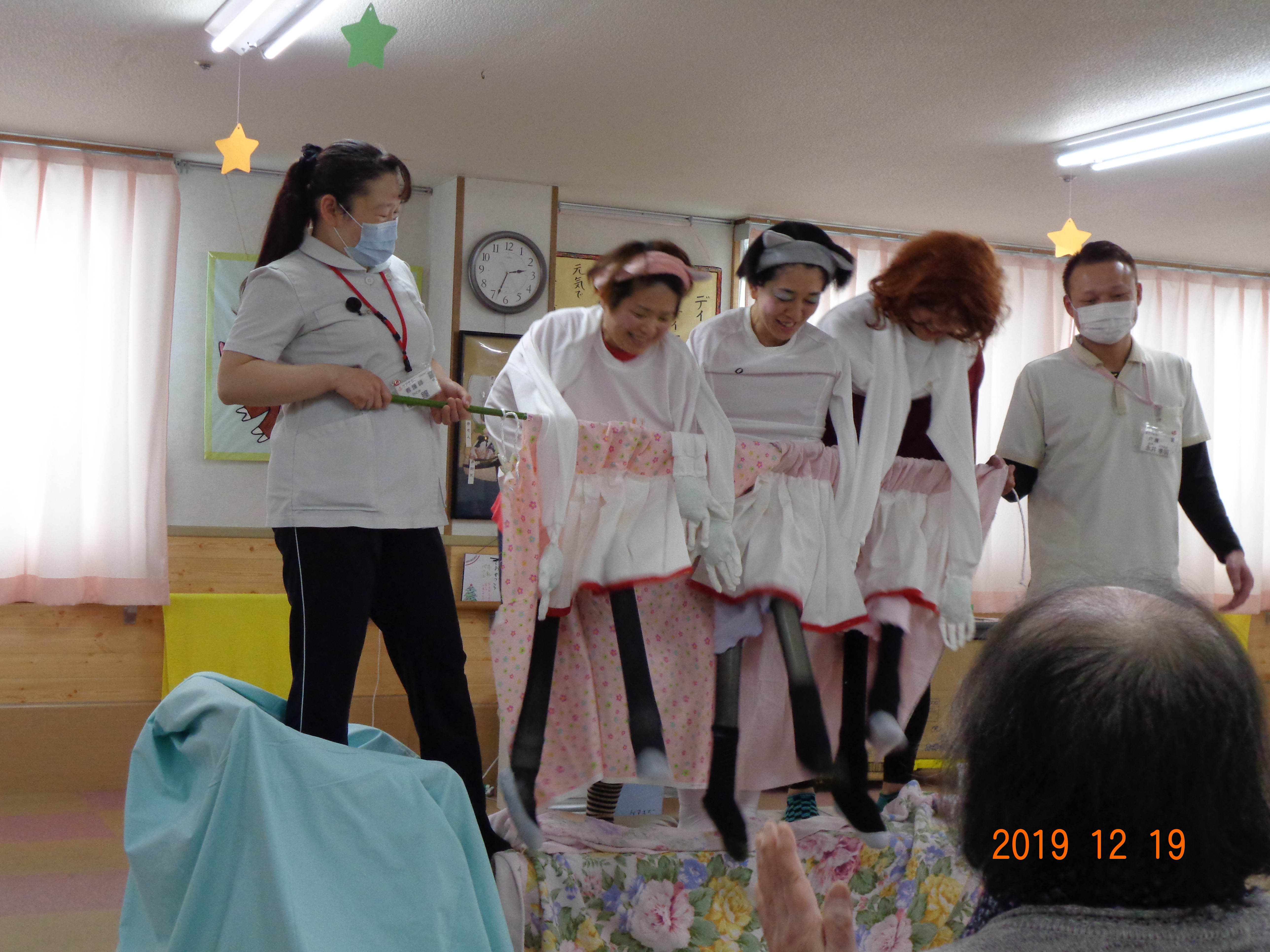 入所ではサンタクロースも登場しクリスマスプレゼントは利用者さんに好評でした。 ボランティアの貴山観桜み会さんの日本舞踊はとても素晴らしかったです。 デイケアは職員の余興でラインダンスをしたり、デュエットで二輪草を歌いました。利用者さんも余興体操をしてくださり楽しい時間を過ごせました。
