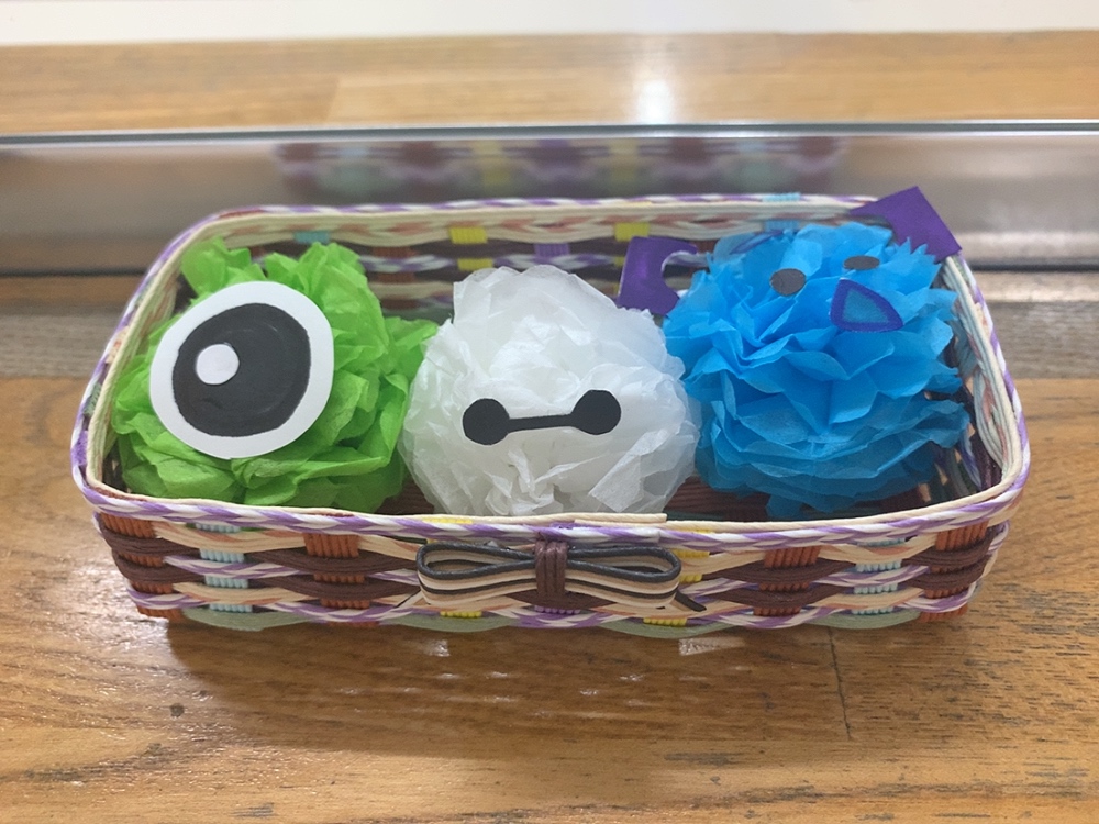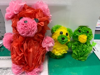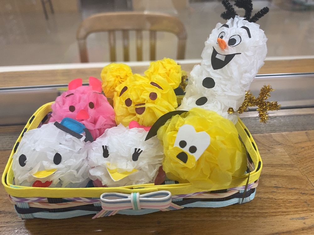 レクレーション制作でお花紙を使って沢山の作品ができまた。利用さんが開いてくれた、お花紙を作業療法士が目や鼻を付けてたくさんのキャラクターが出来上がりました。