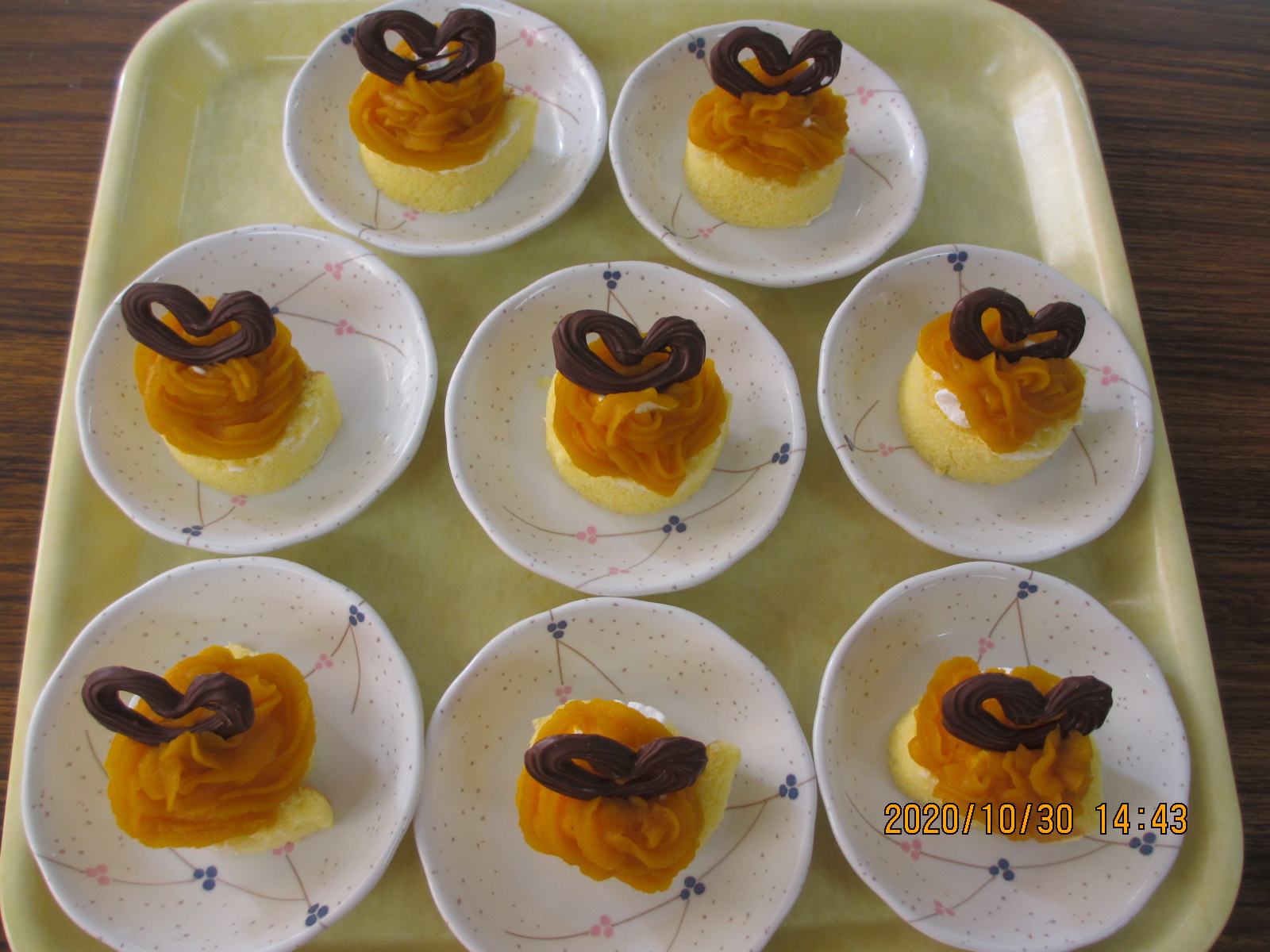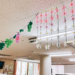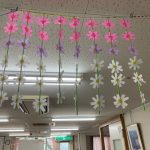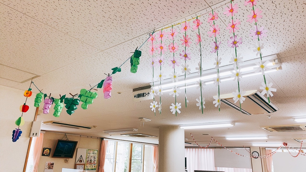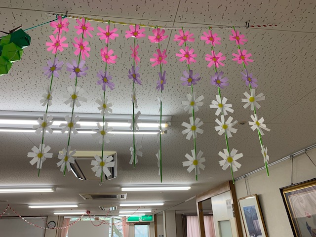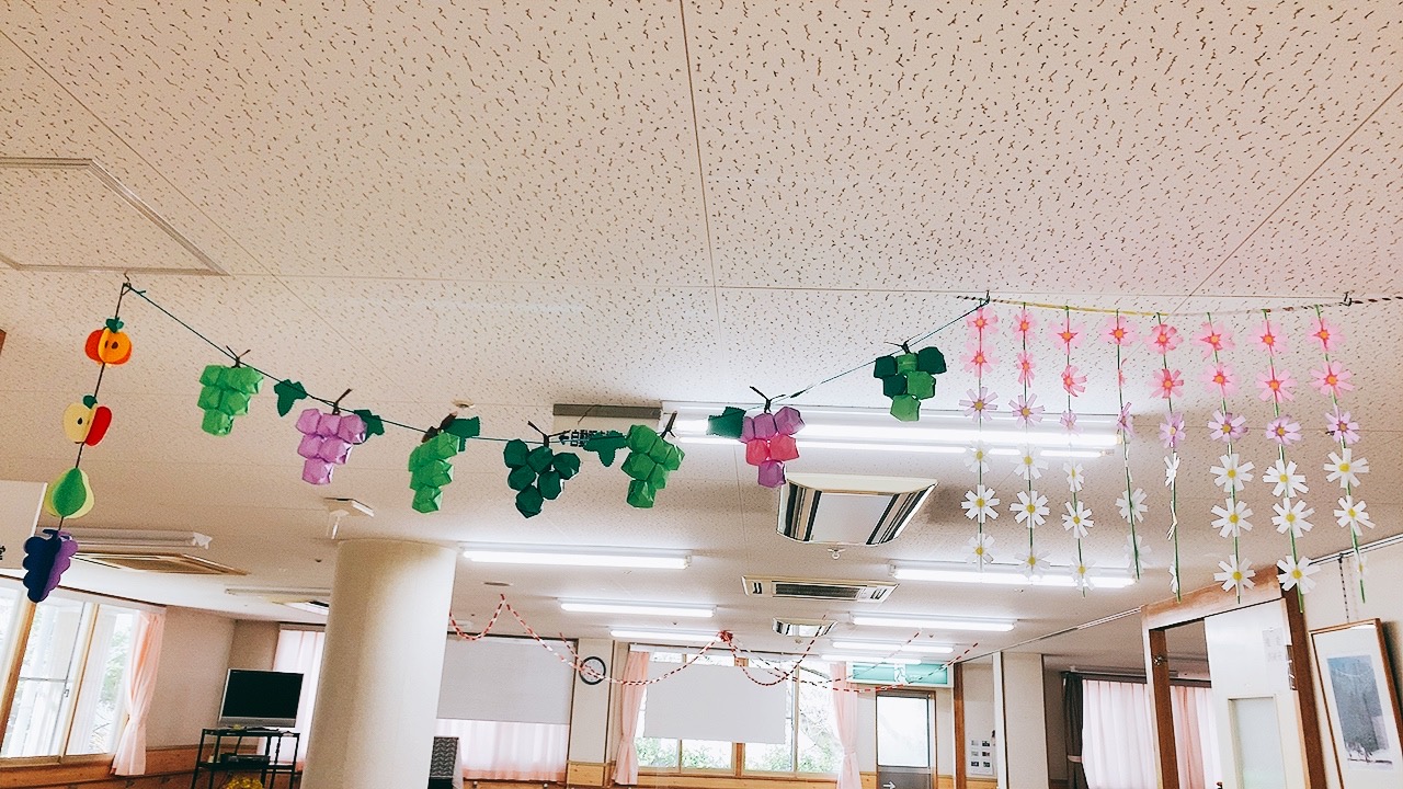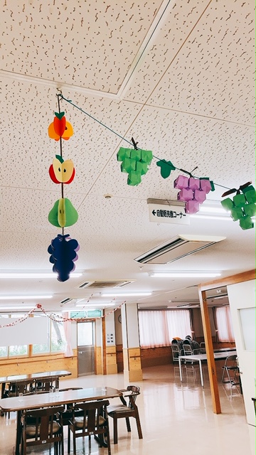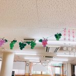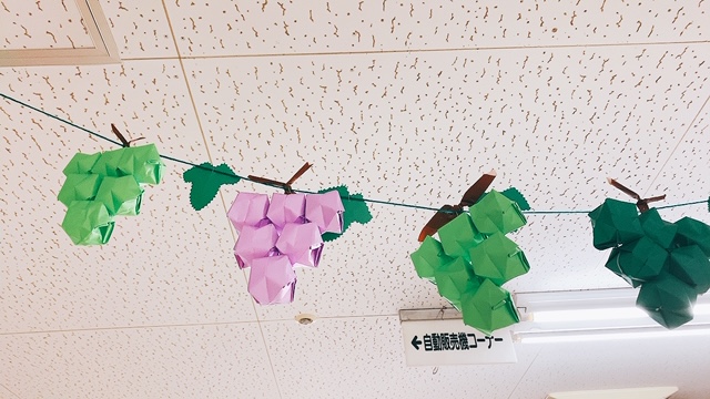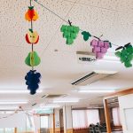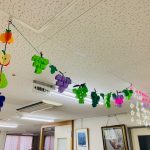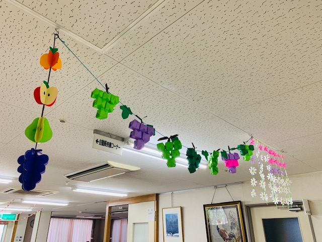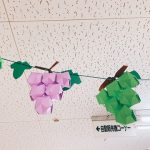 今回のレクレーション制作は秋の味覚の果物(ぶどう・柿・りんご・洋ナシ)とコスモスを制作しました。