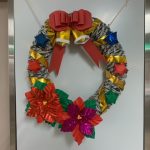 クリスマスリースは利用さんが新聞紙を丸め棒状にした物を作業療法士が編み込んで作りました。