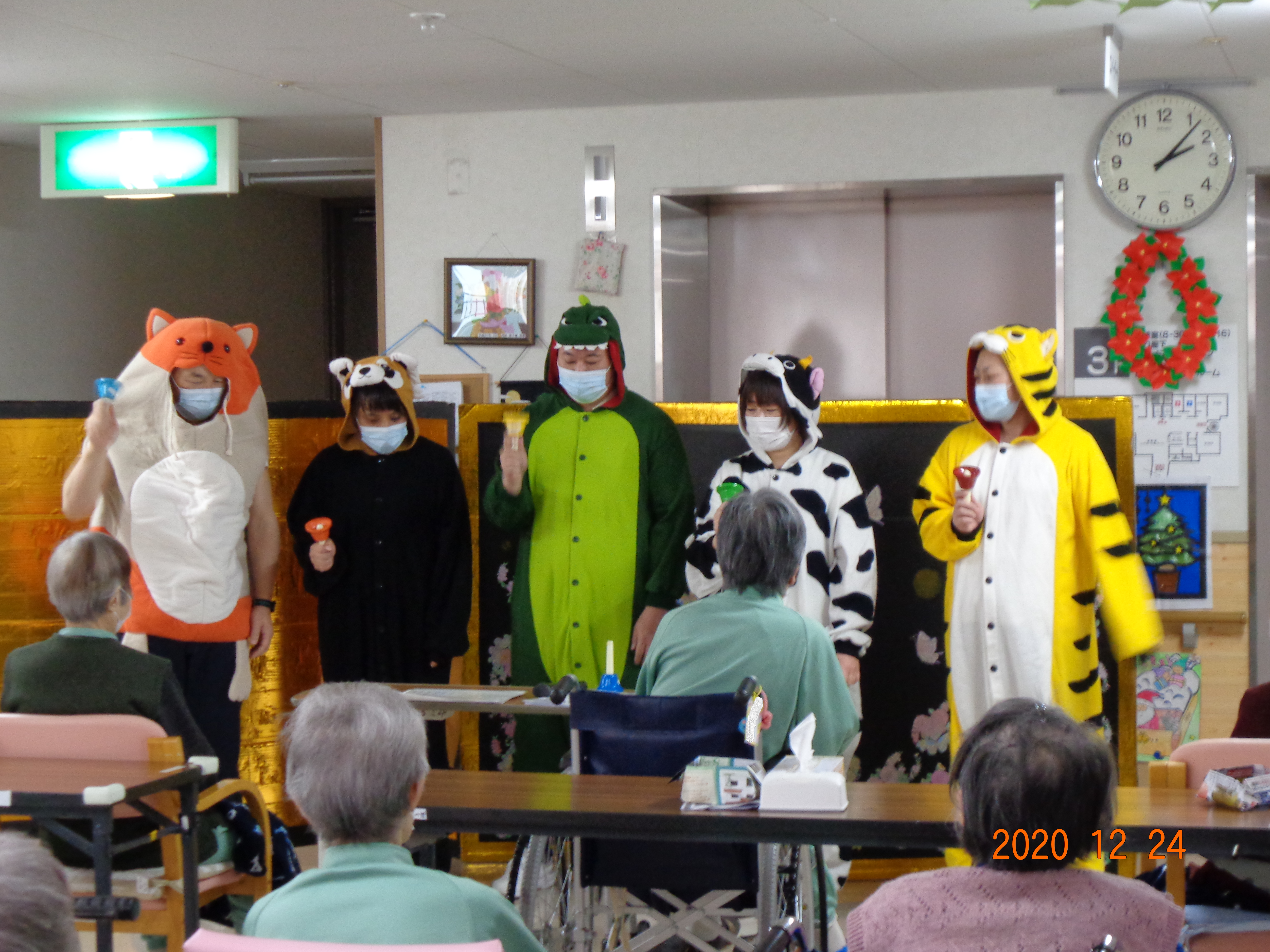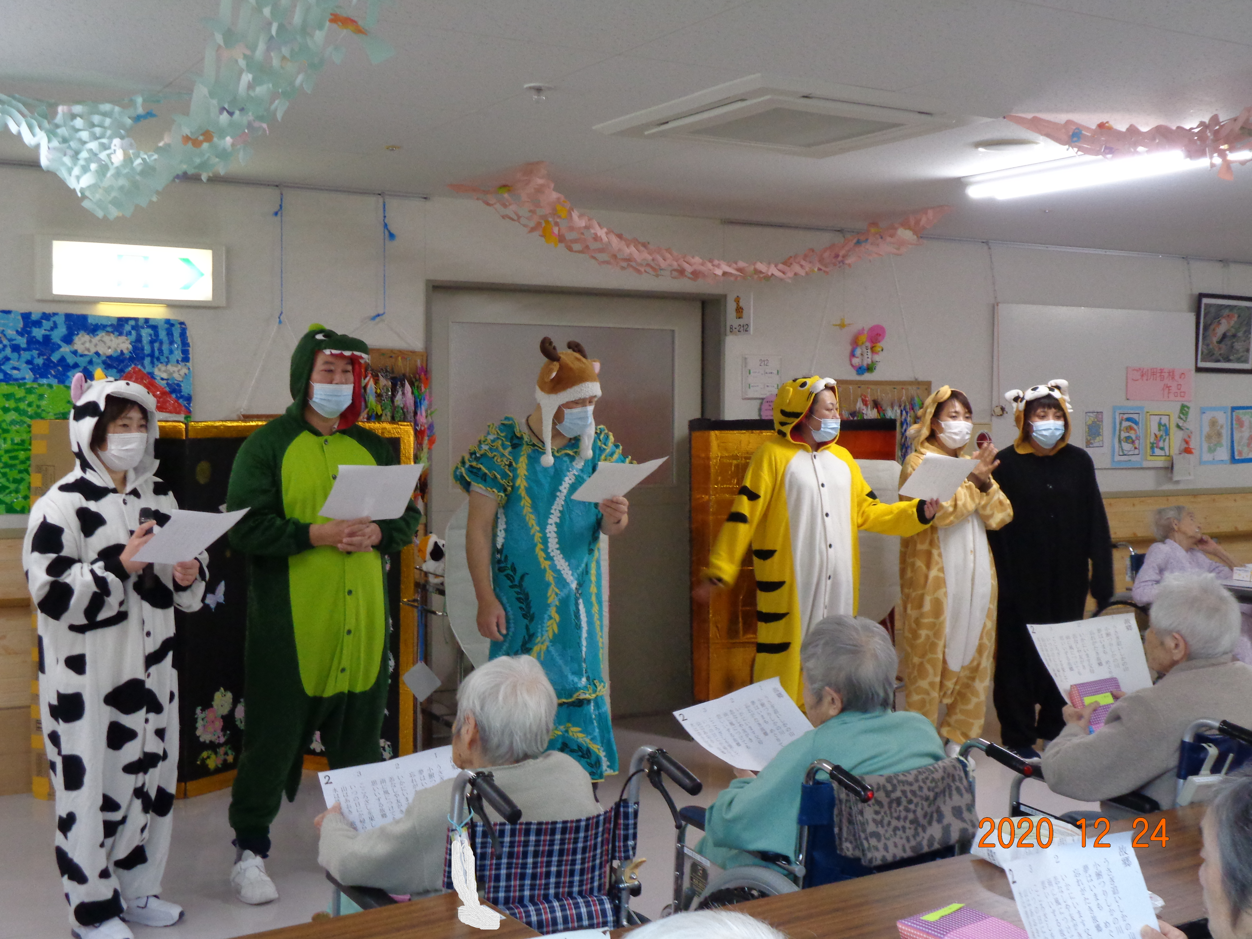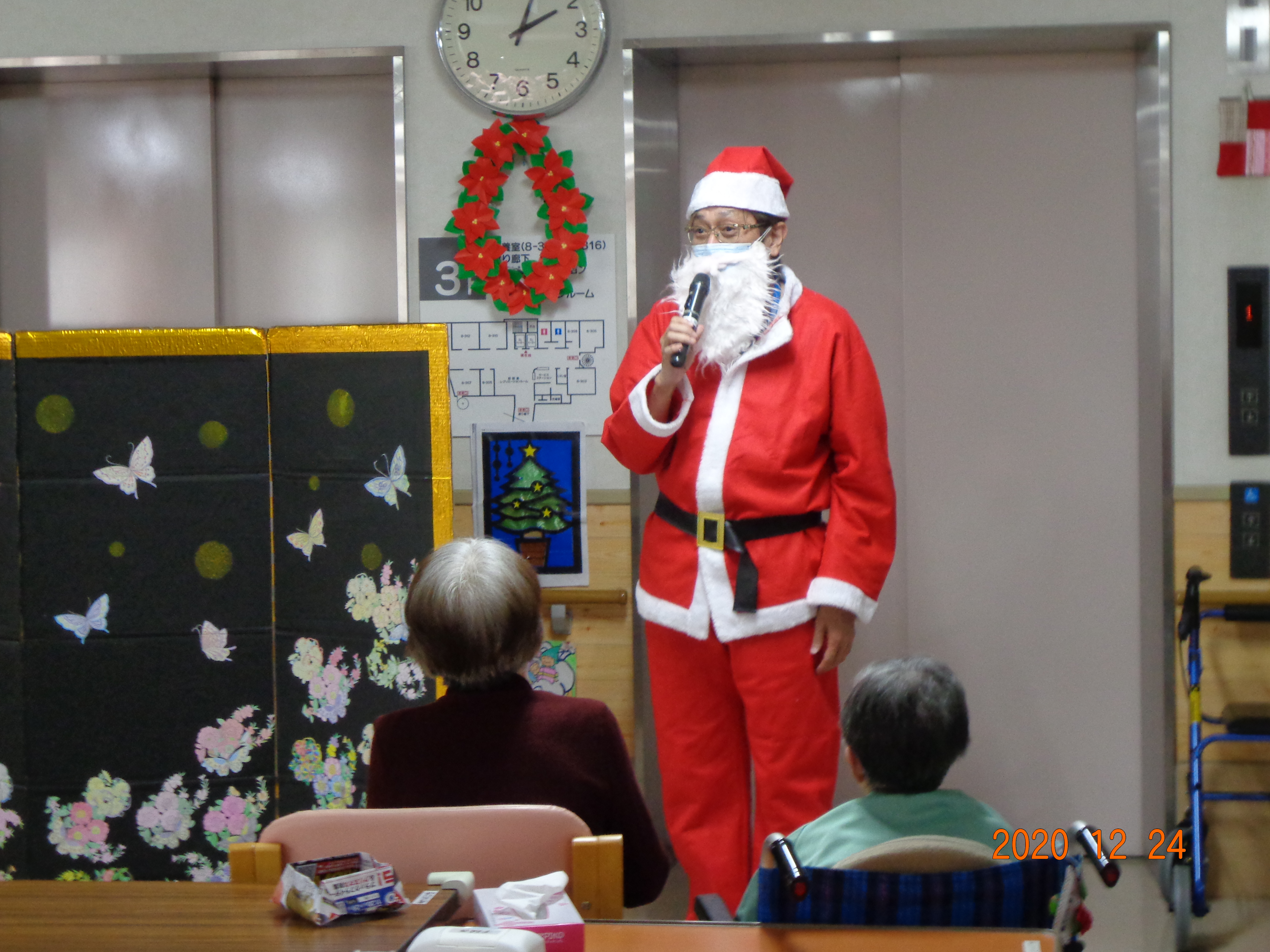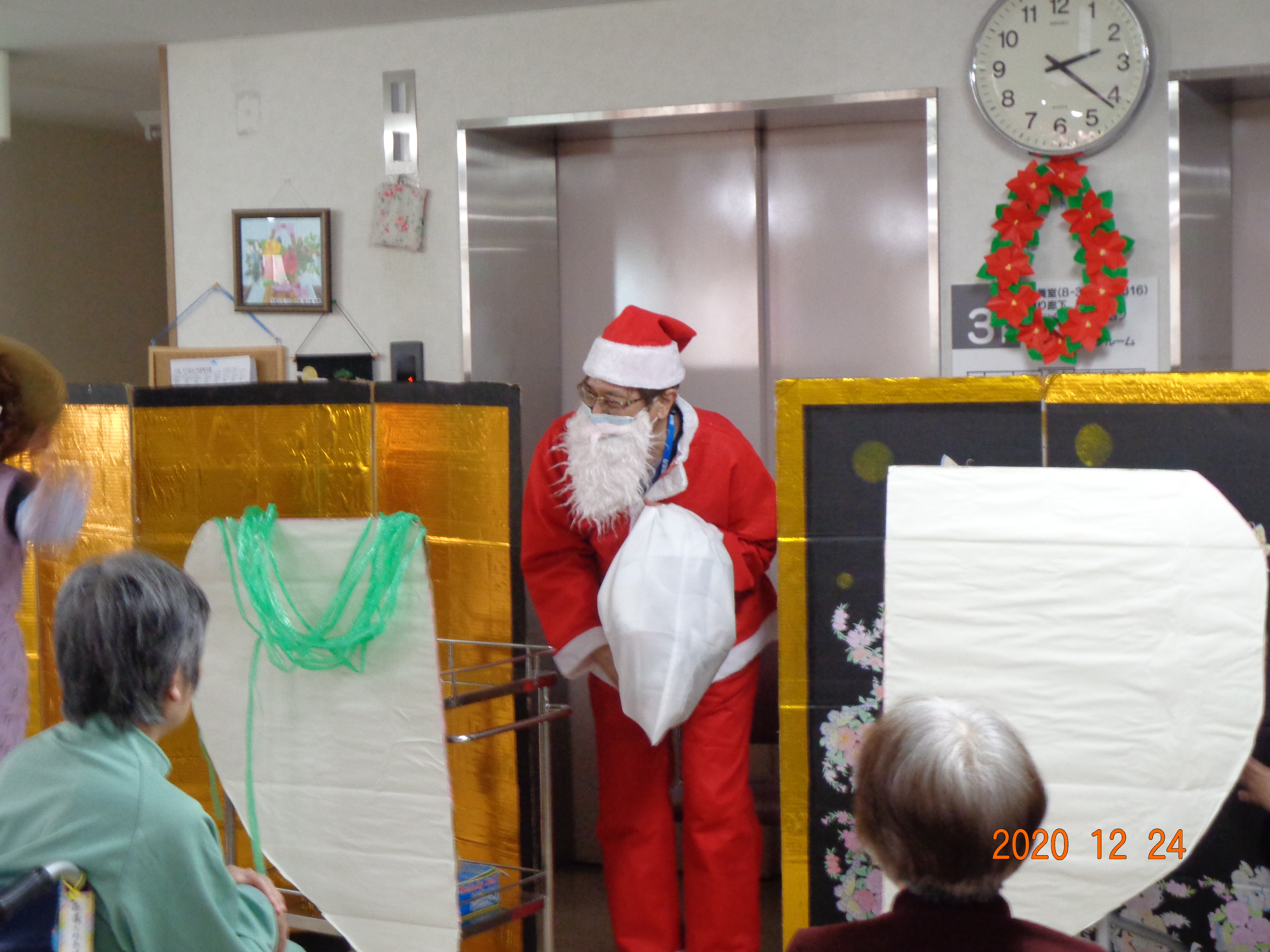 利用者さんにサンタクロースからプレゼントが配られました。クリスマスケーキに職員の余興でクリスマスを楽しました。