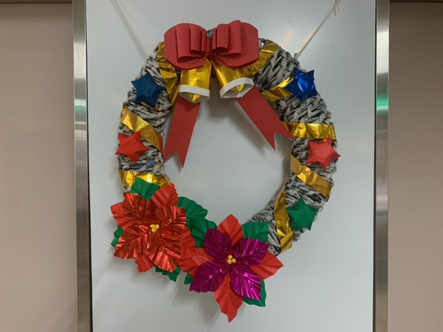 クリスマスリースは利用さんが新聞紙を丸め棒状にした物を作業療法士が編み込んで作りました。