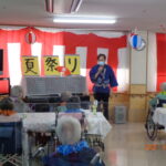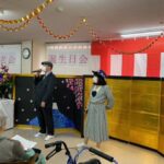 余興では職員が利用者さんの若い頃に流行した服装で登場し、「二人は若い」を歌い楽しみました。