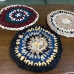 靴下のハギレを使った編み物作品です。ケアまるこ入所者で最高齢102歳の利用さんが作りまた!