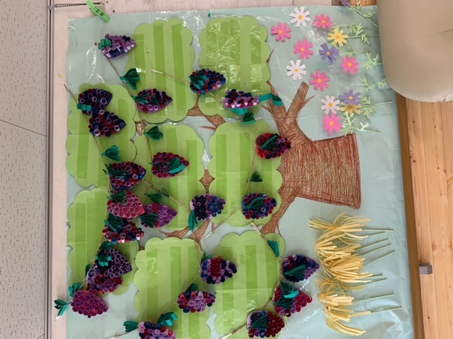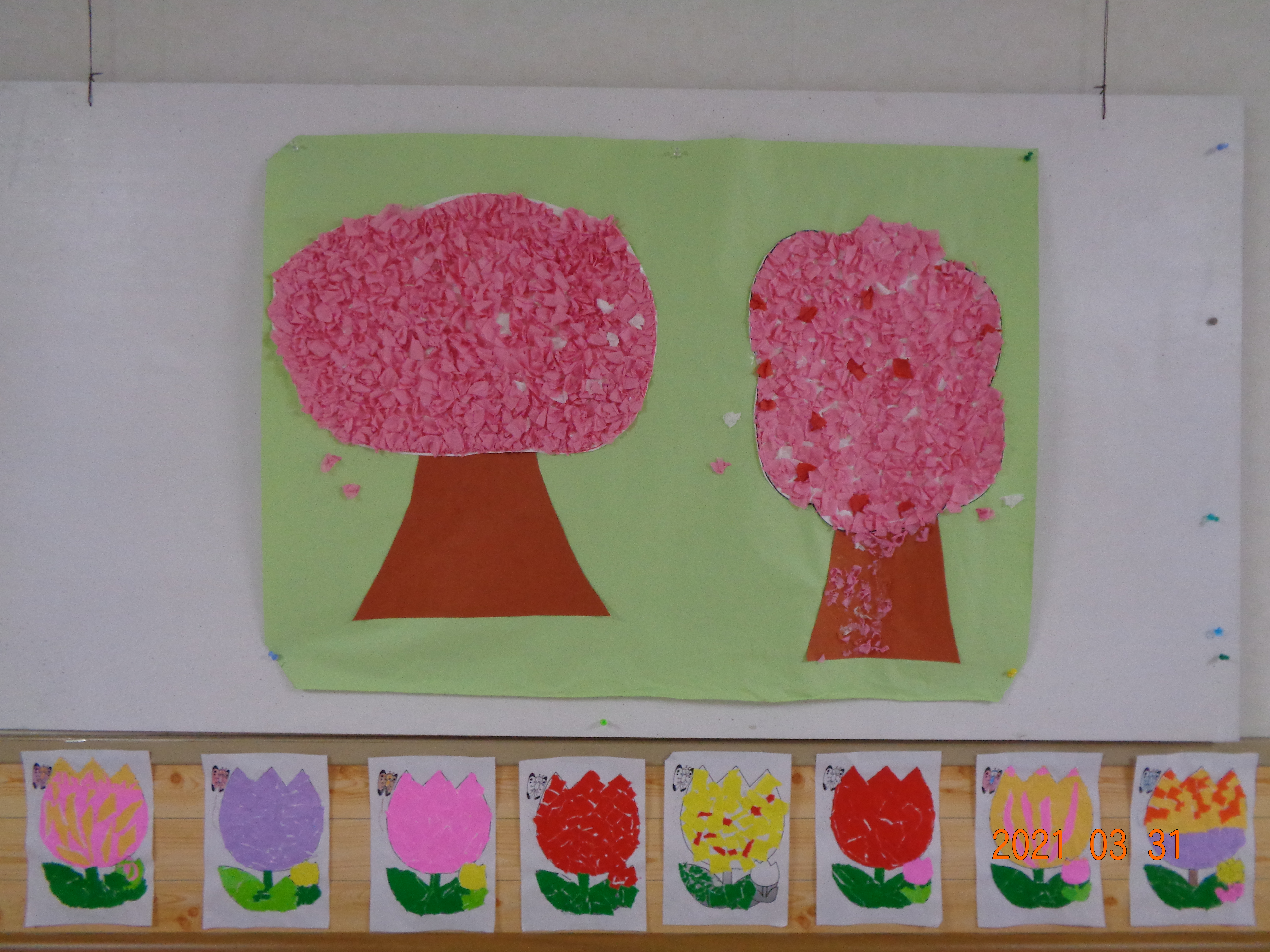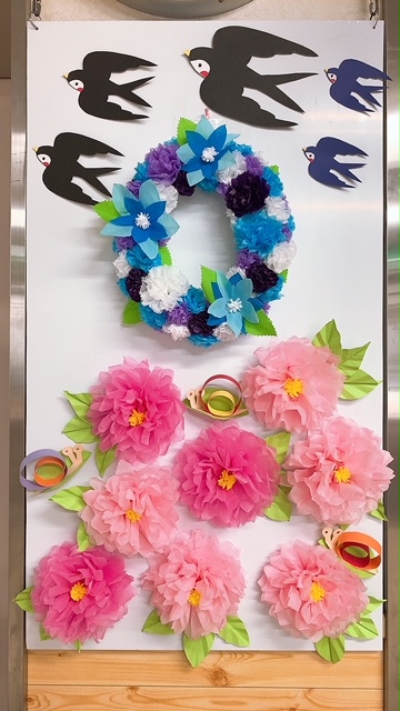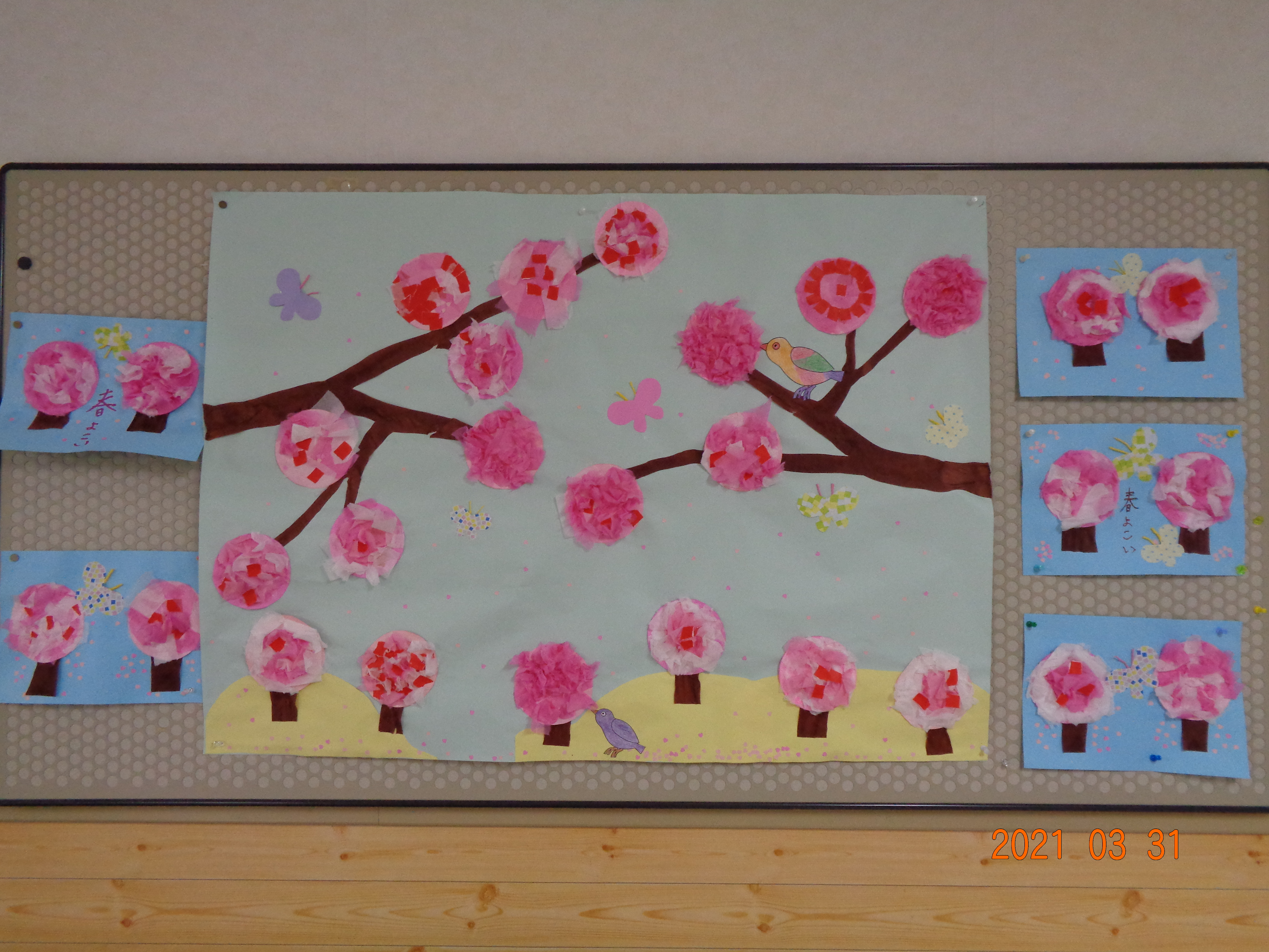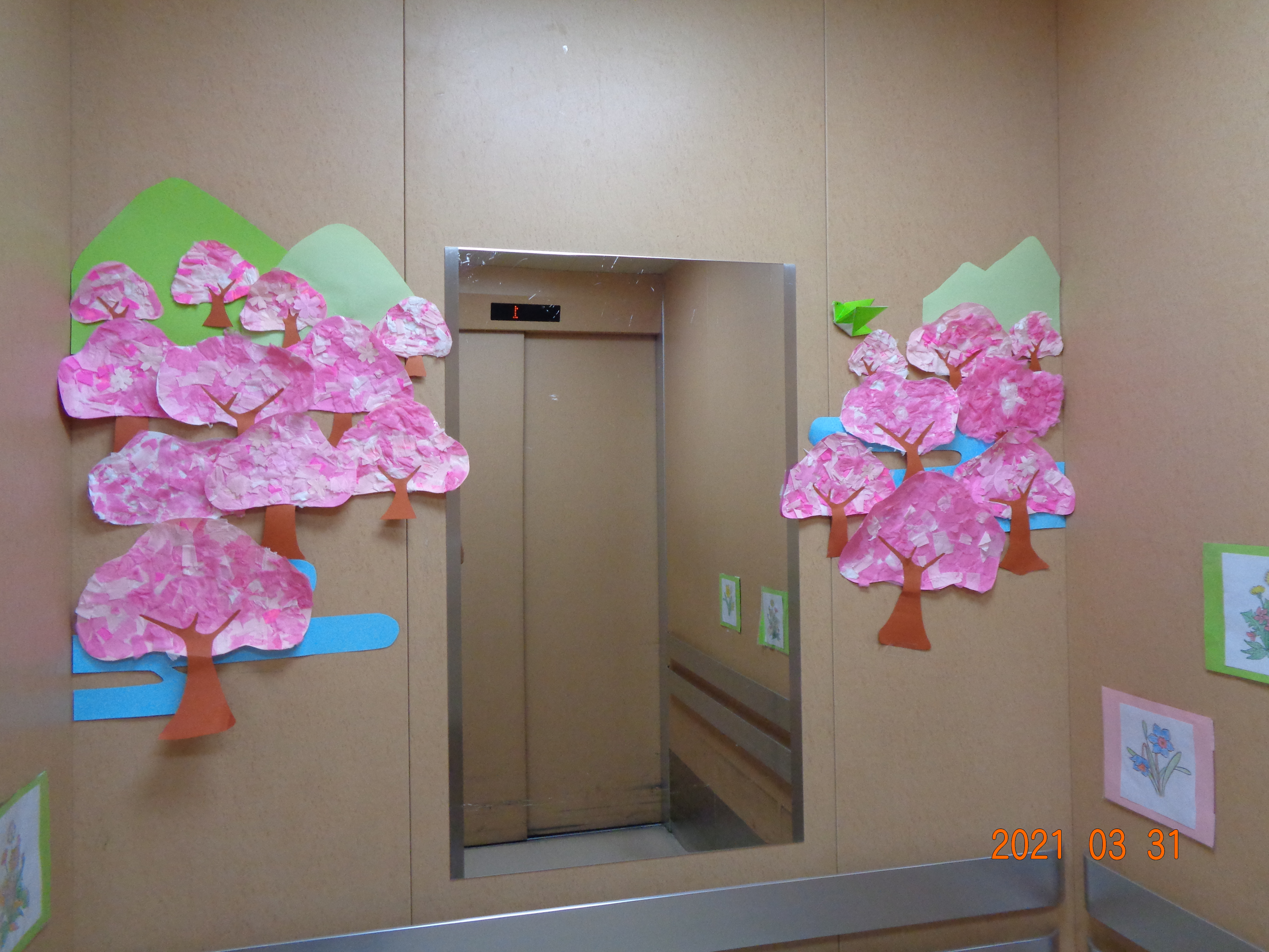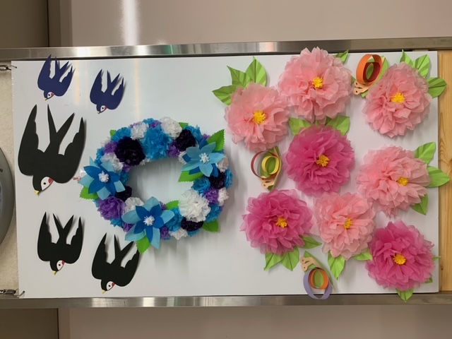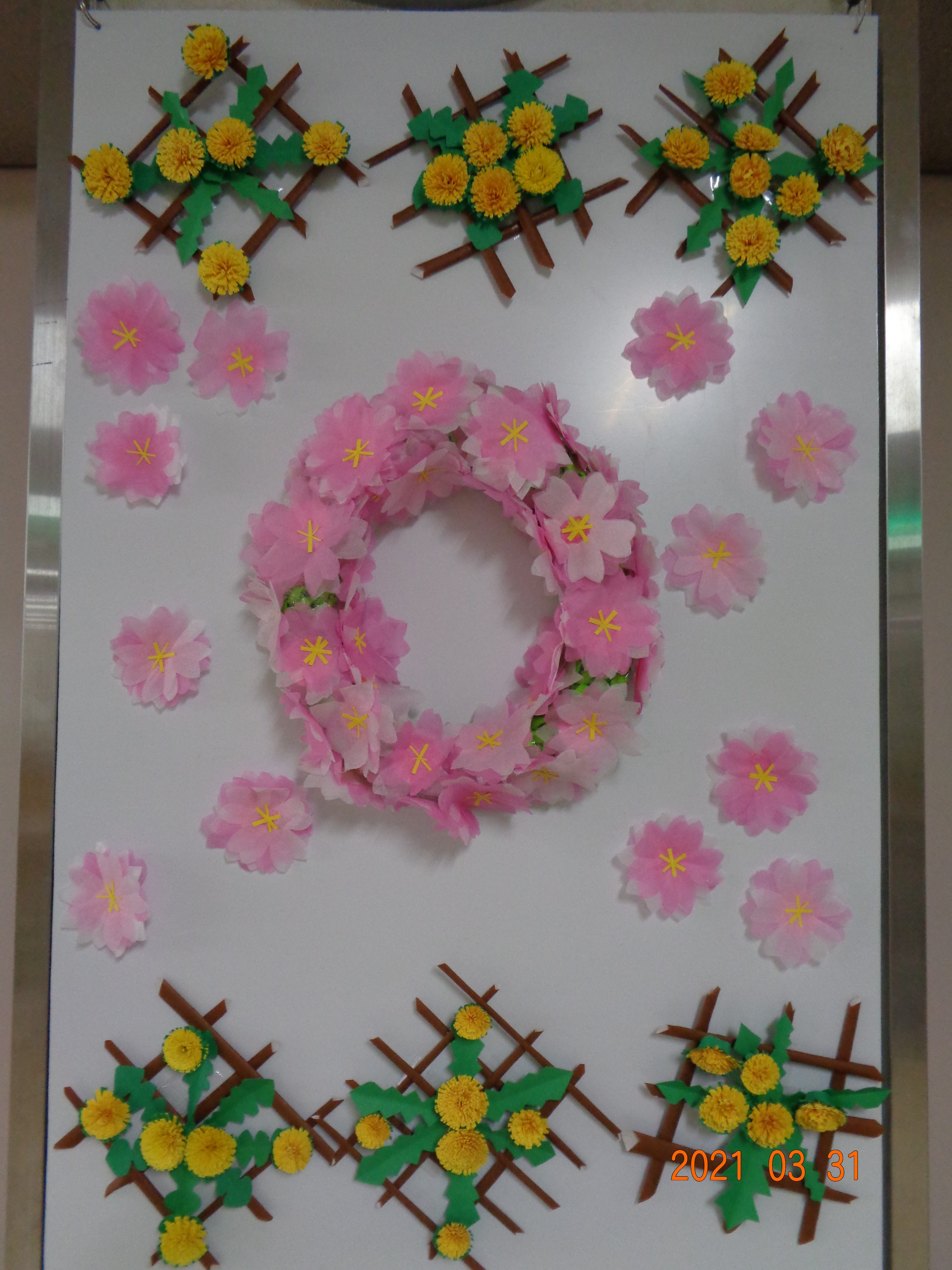 3月は桜をテーマに色々な桜ができました。タンポポやチューリップなどたくさんの花を作り施設内が華やかになっています。