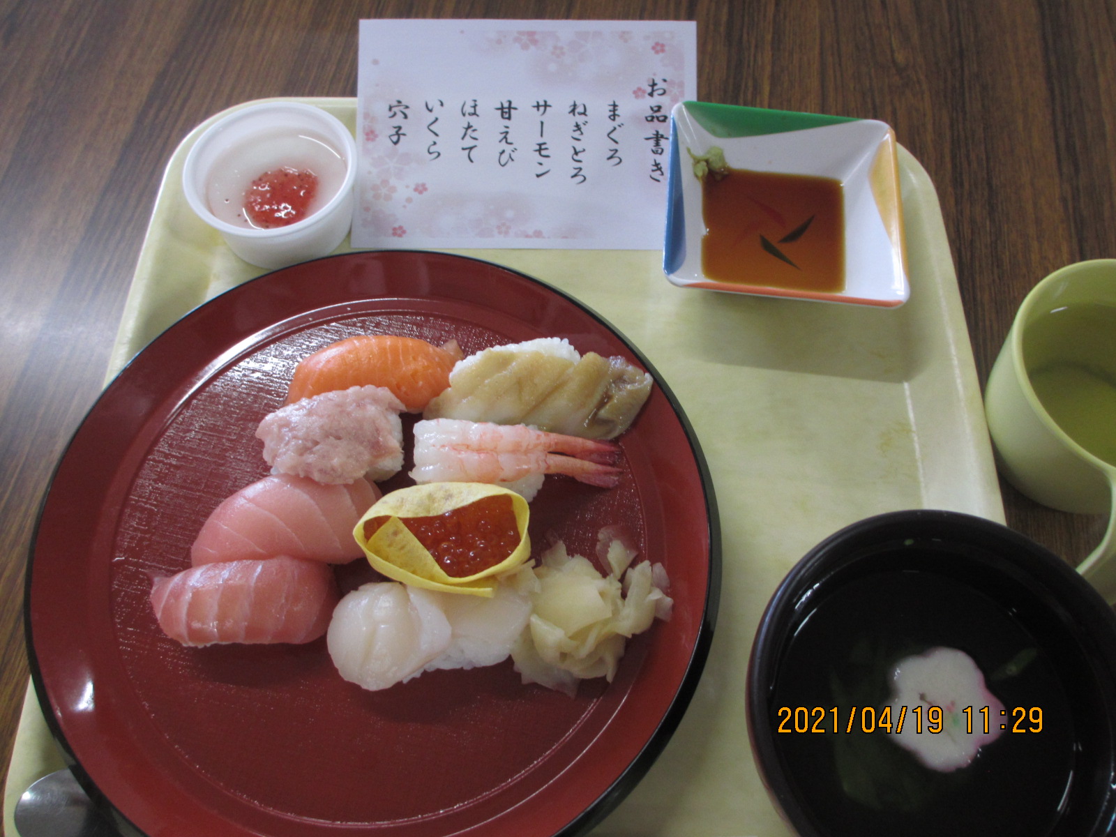 4月19日は寿司ランチでした。今回は新しいネタで穴子が入り利用者さんにとても好評でした?