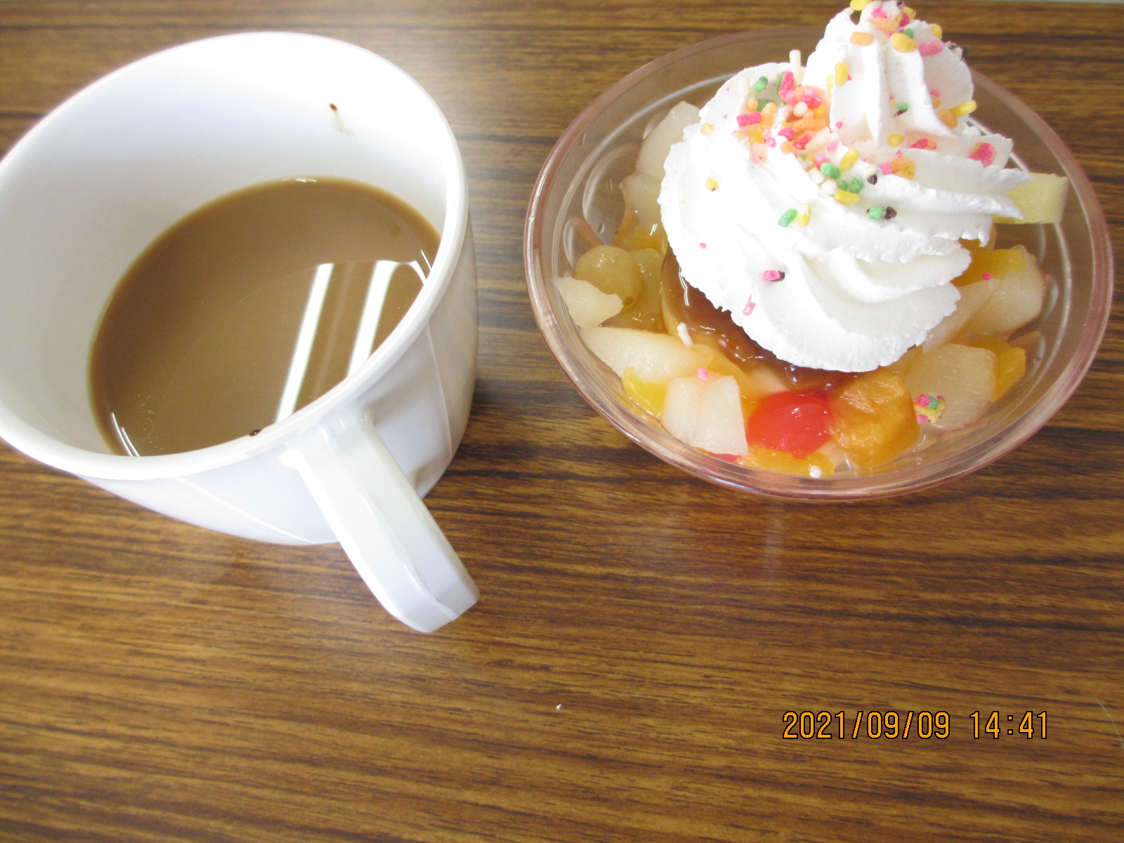 今月の手作りおやつはプリンアラモードでした。それぞれフルーツとクリームをトッピングしました?