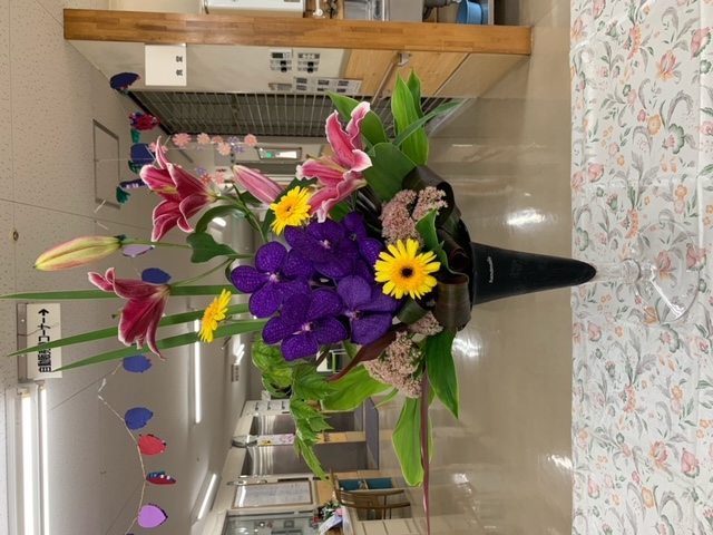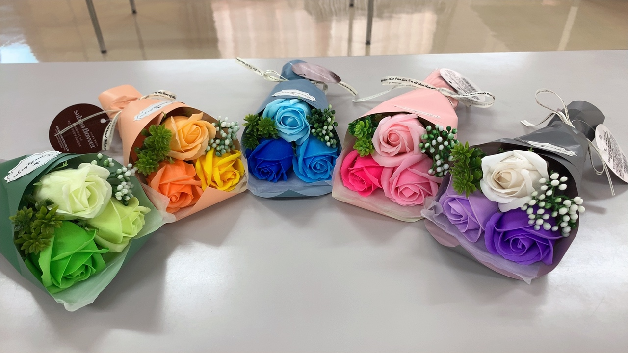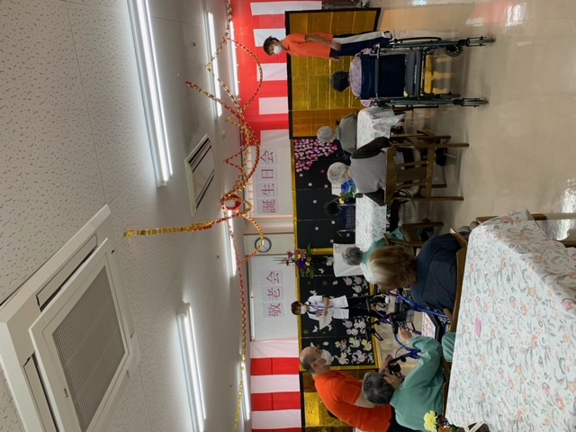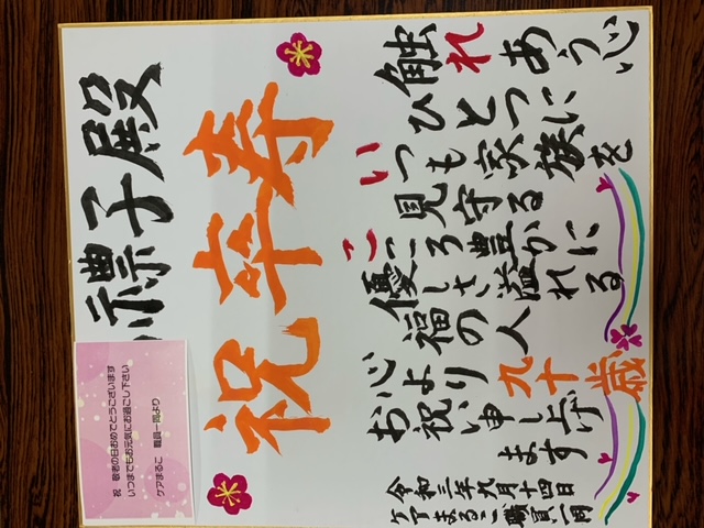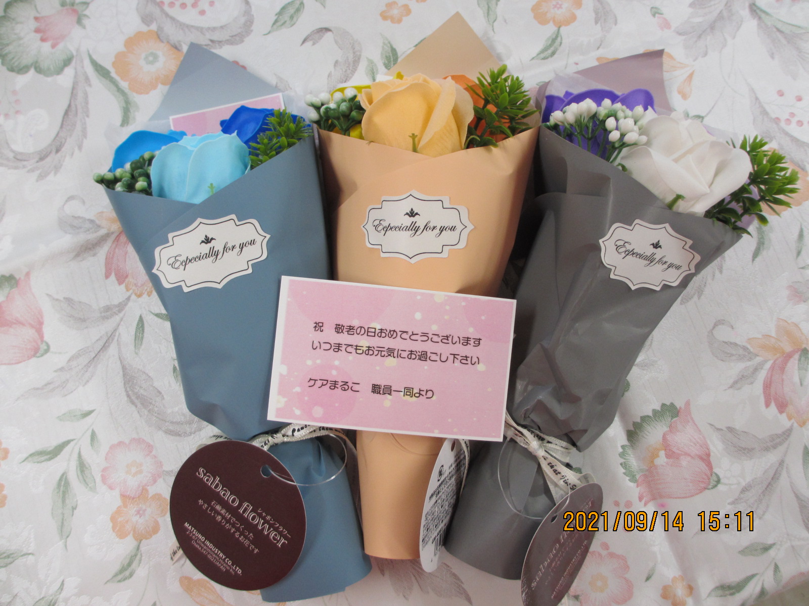長寿祝いの節目の利用者さんには職員手書きの色紙を、利用者全員にケアまるこよりソープフラワーをプレゼントしました。