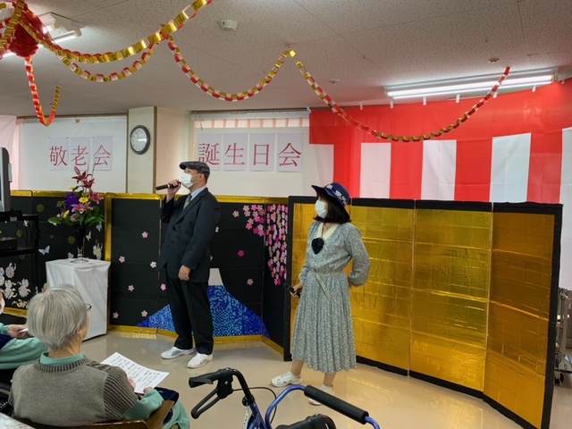 余興では職員が利用者さんの若い頃に流行した服装で登場し、「二人は若い」を歌い楽しみました。