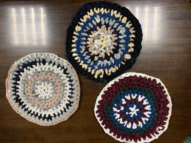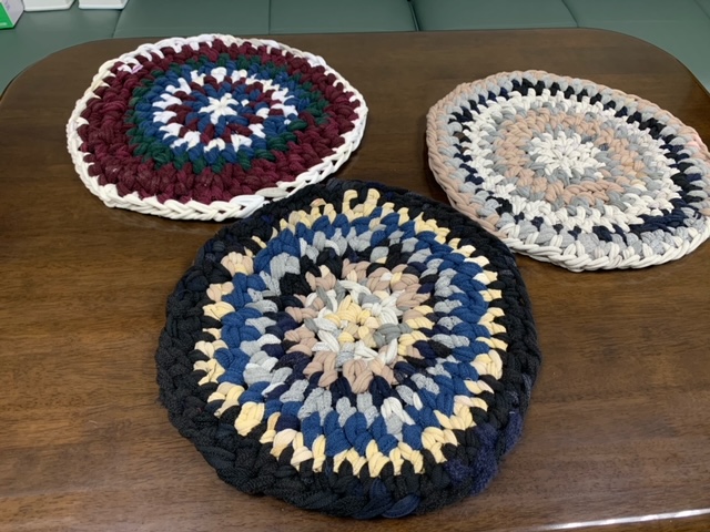 靴下のハギレを使った編み物作品です。ケアまるこ入所者で最高齢102歳の利用さんが作りまた!