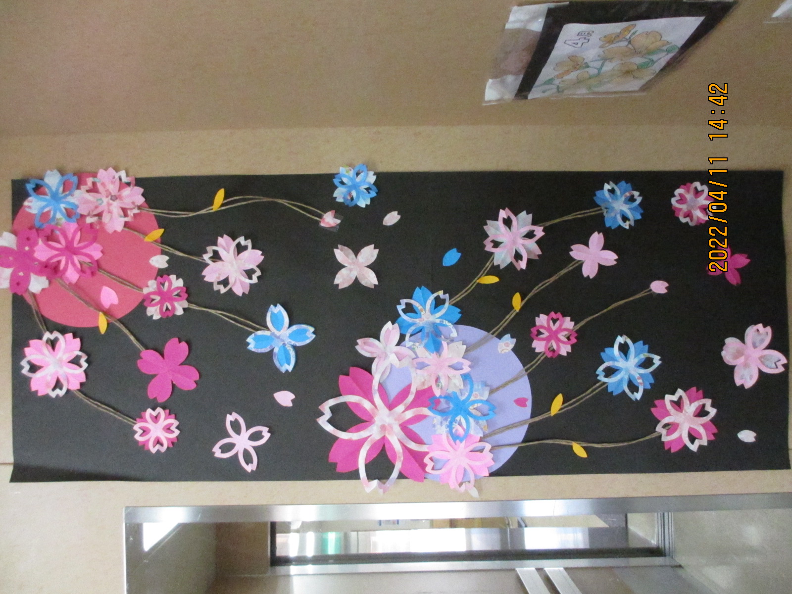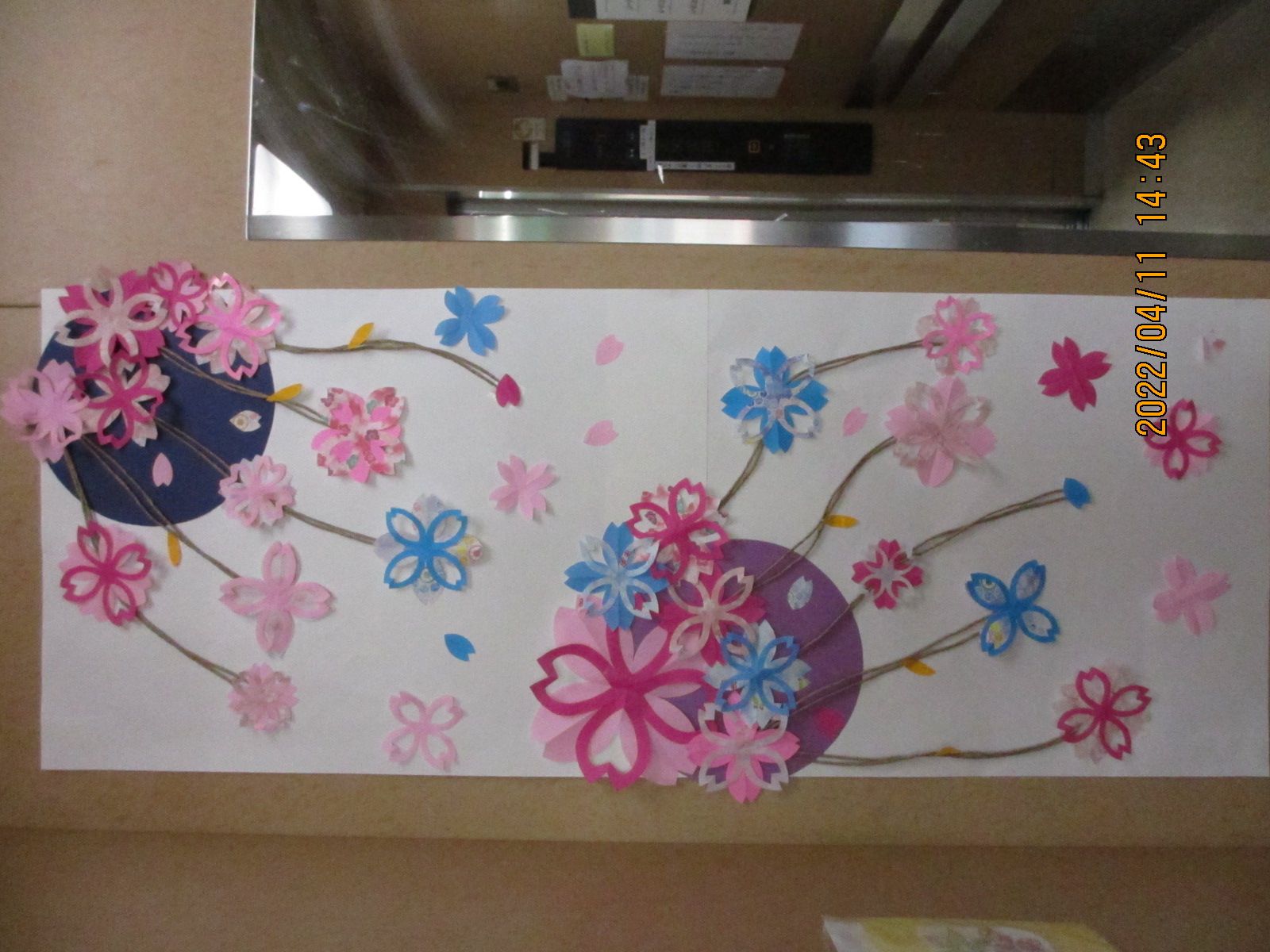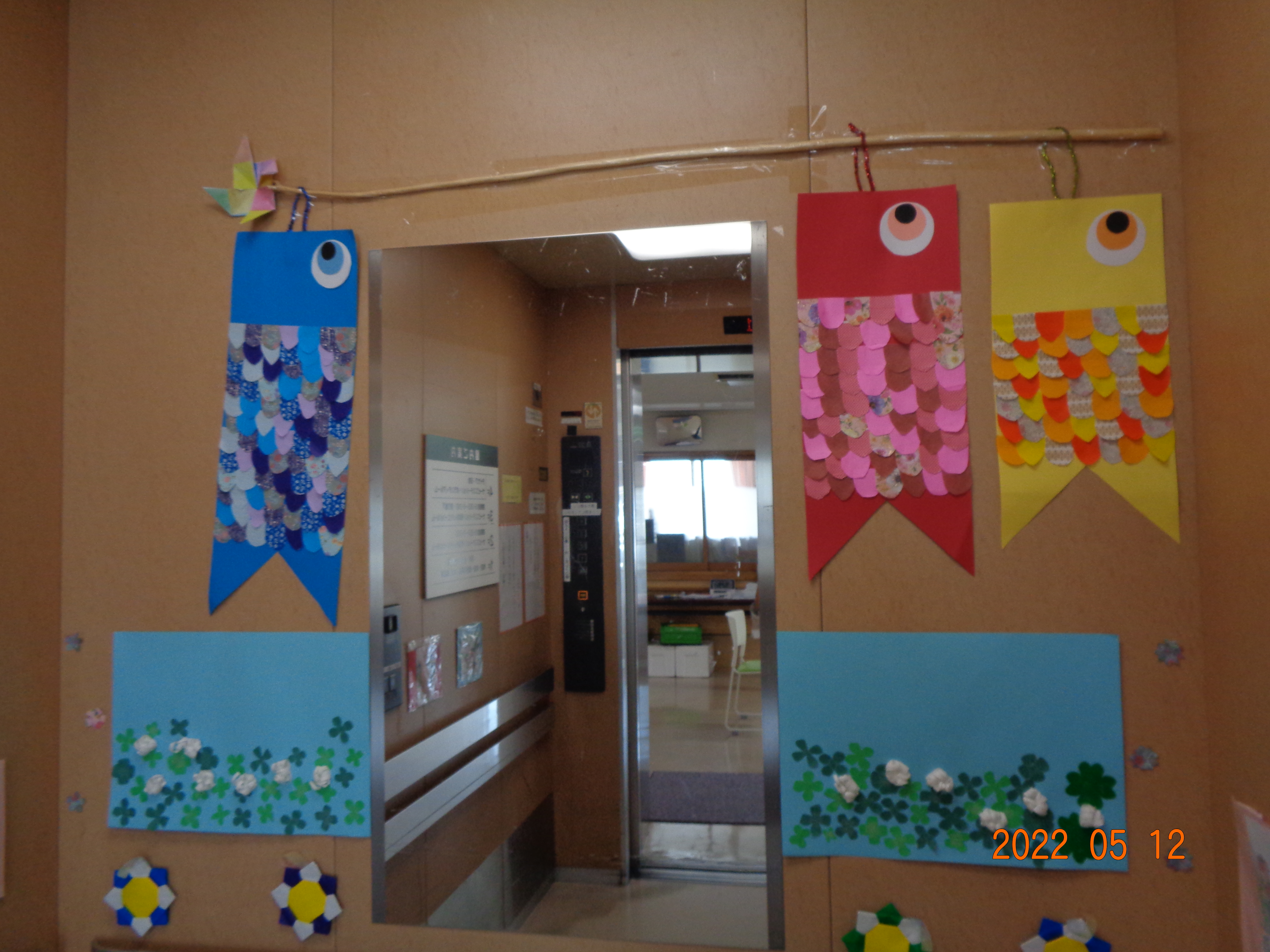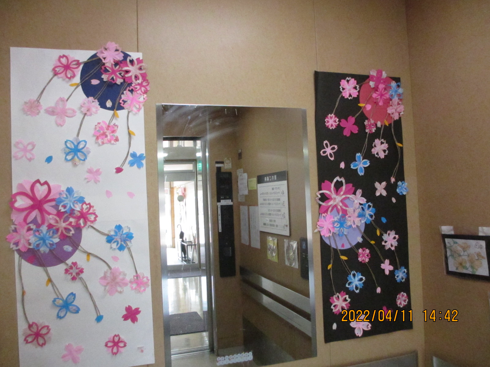 エレベーターの中や入口に作品を飾ってあります。施設内にいても季節を感じられます。