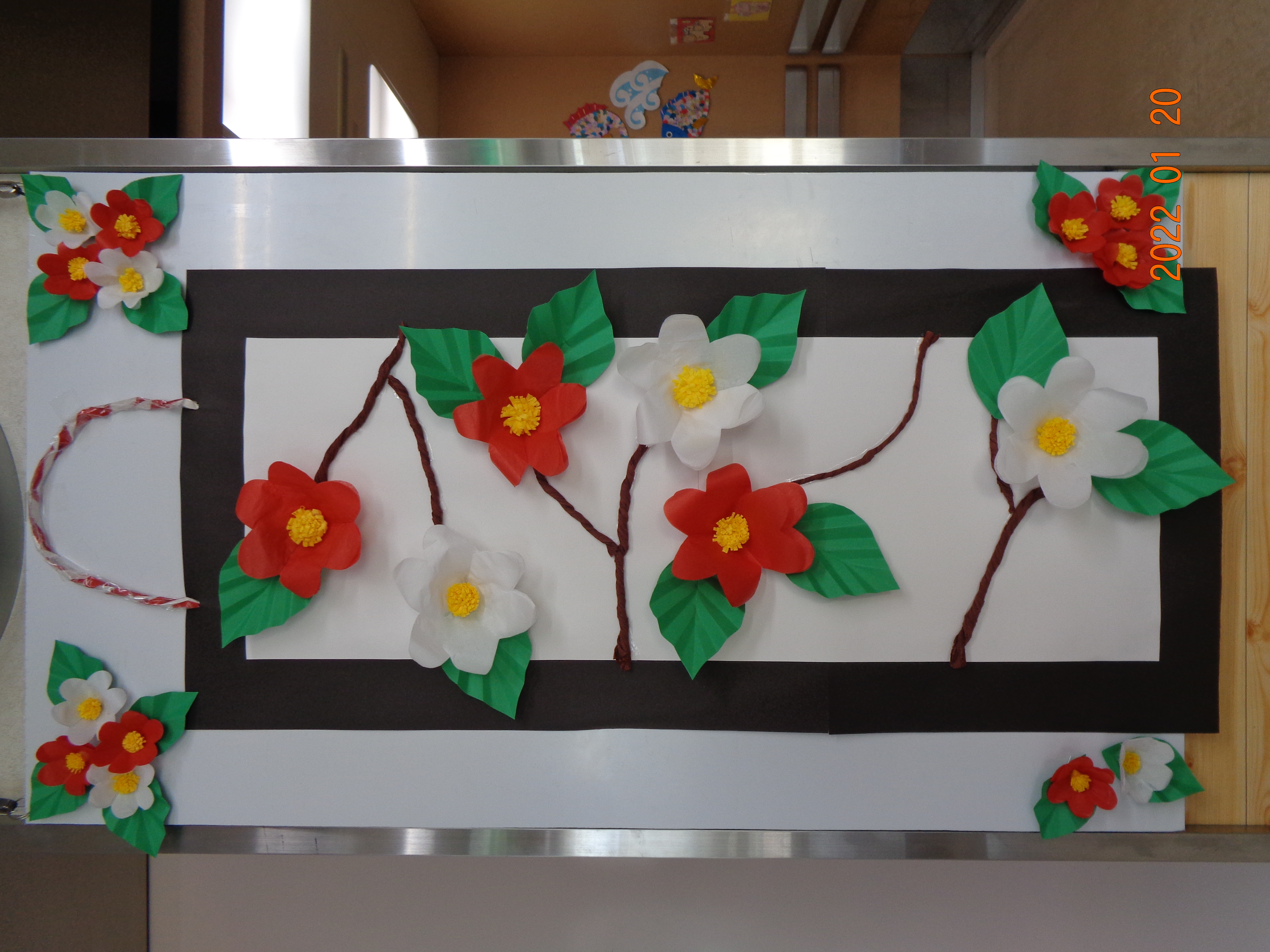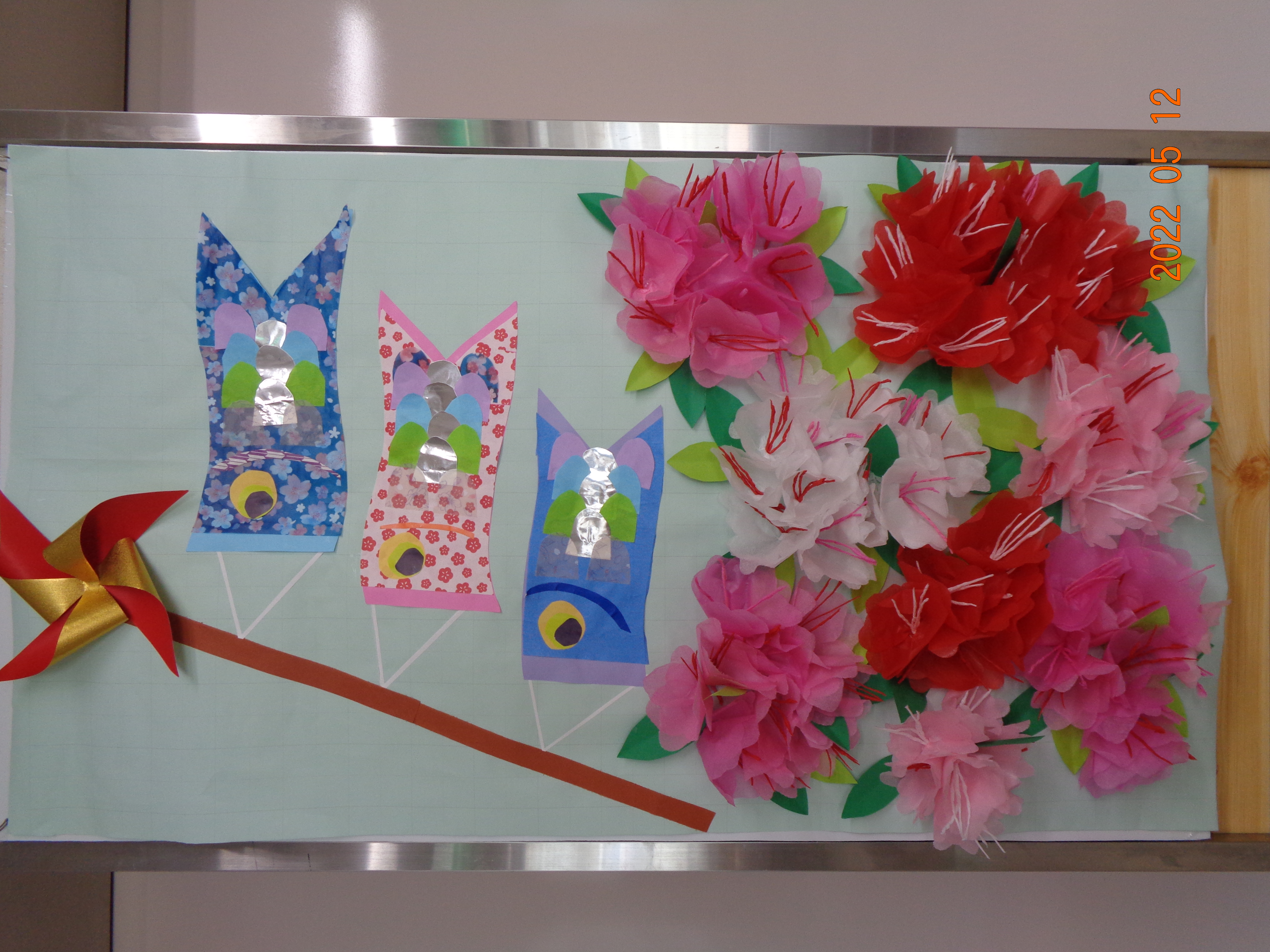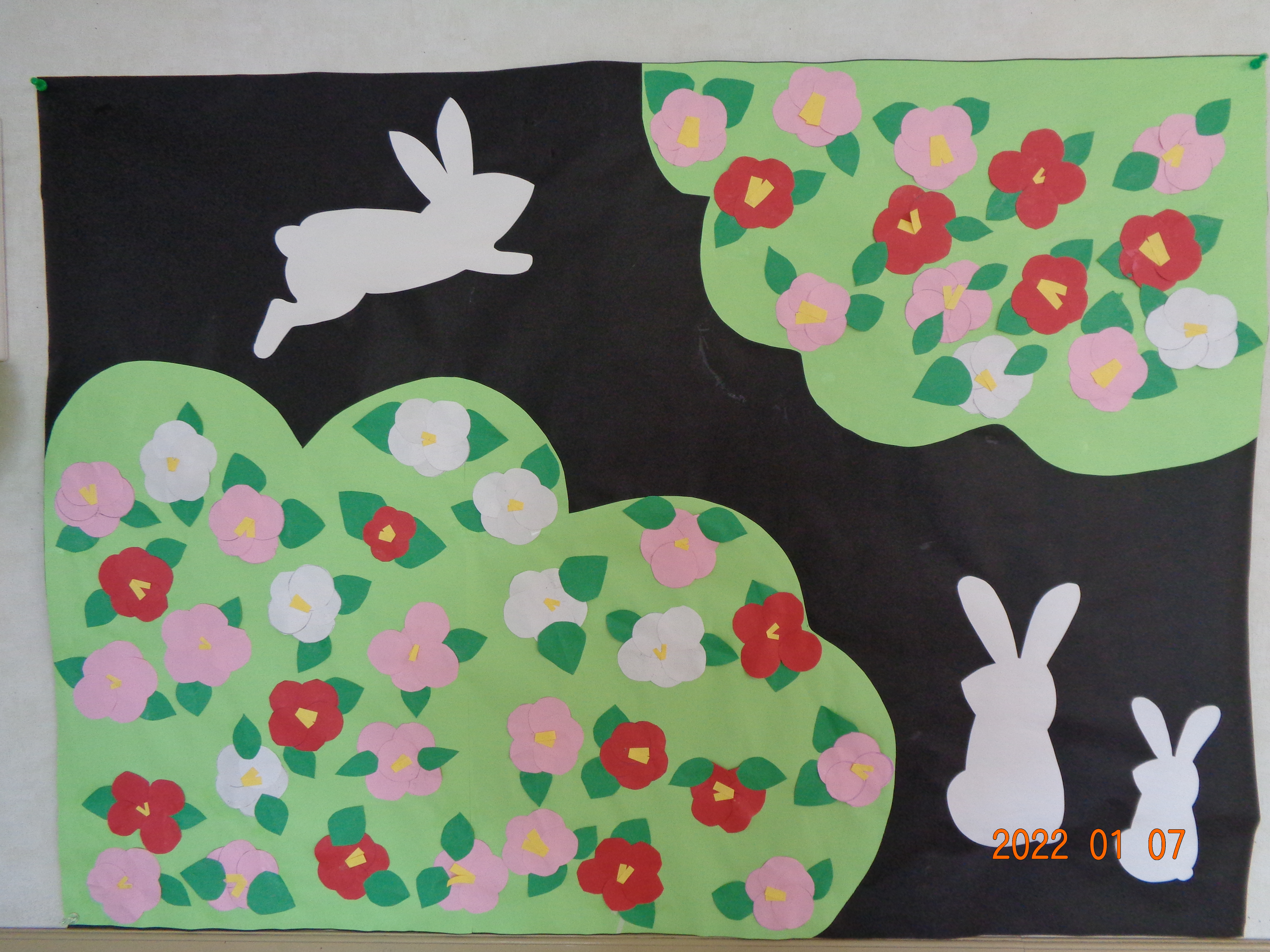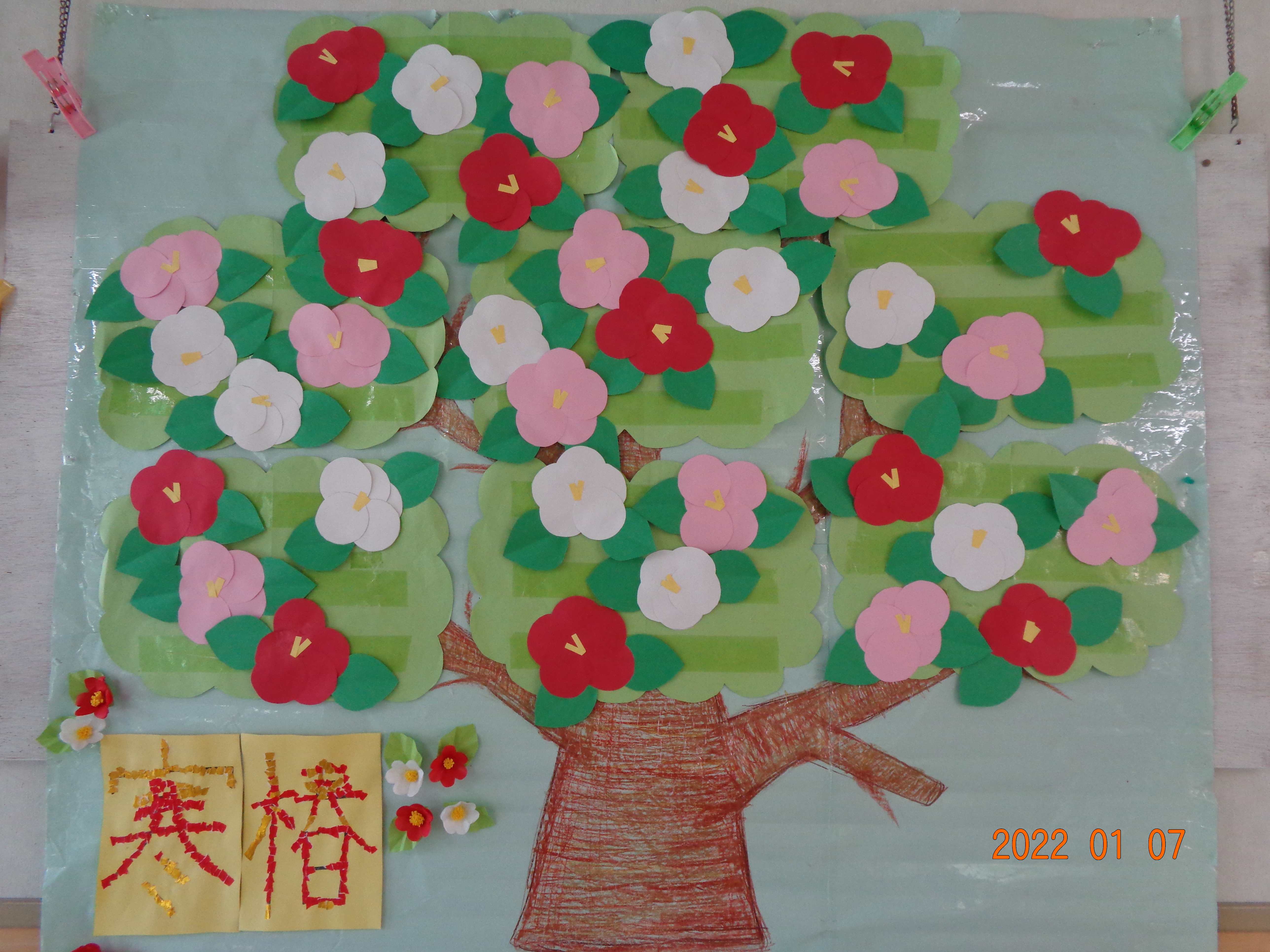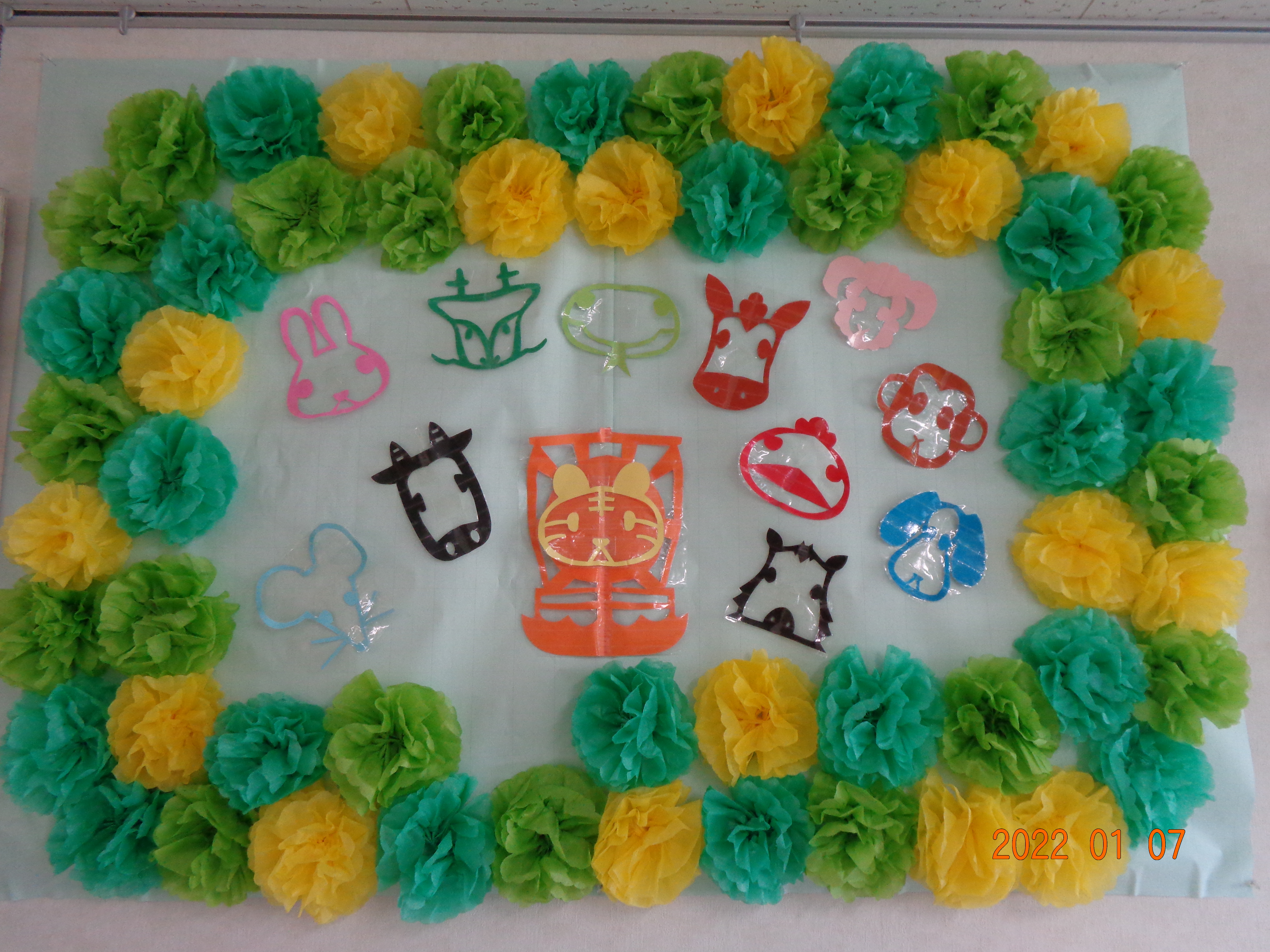 エレベーターの中や入口に作品を飾ってあります。施設内にいても季節を感じられます。