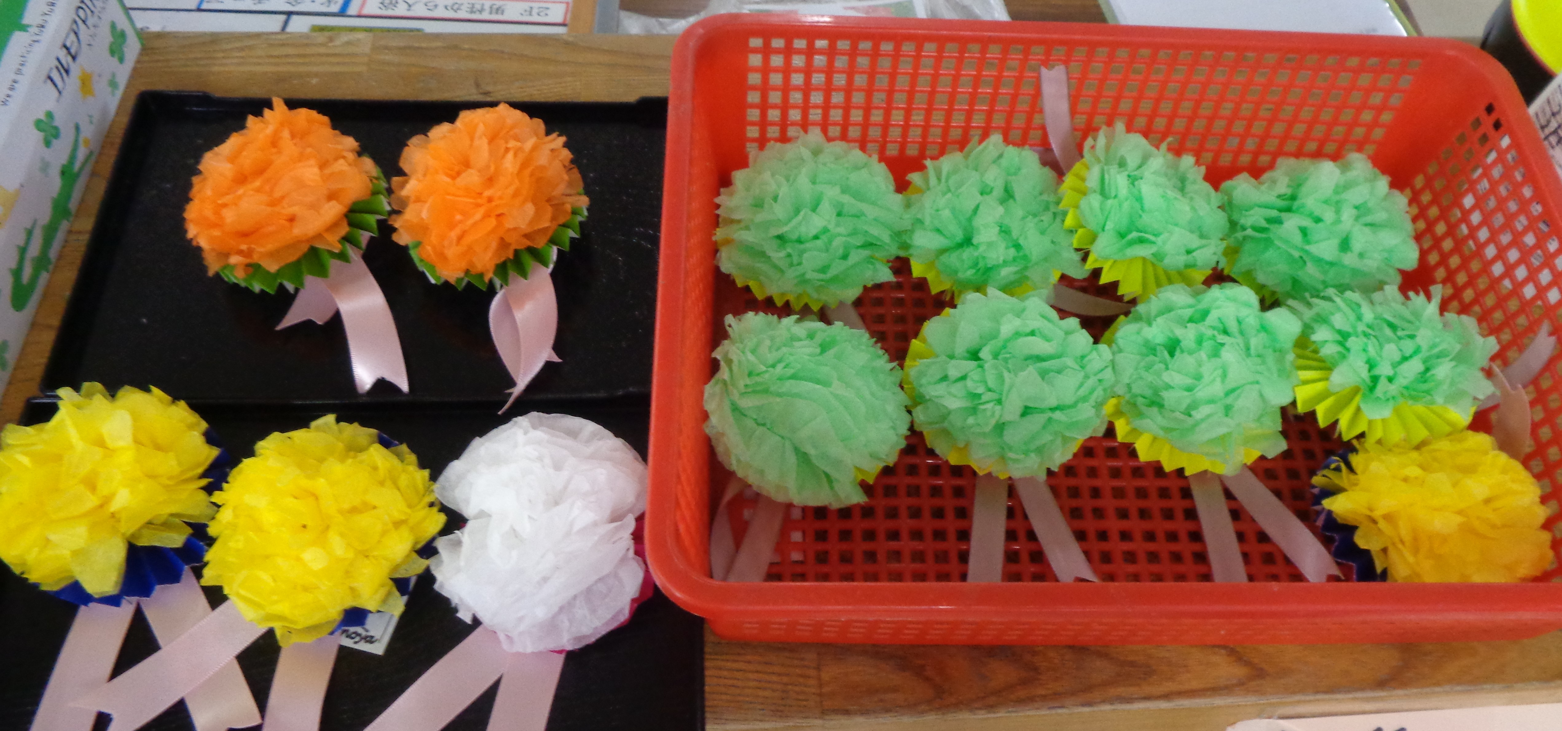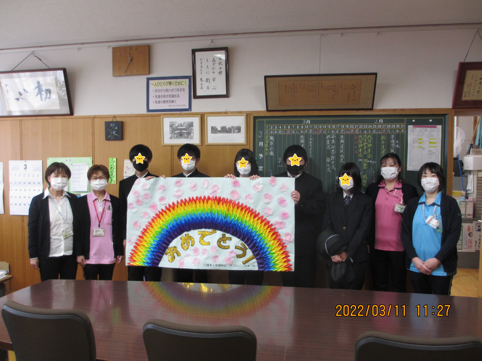 その感謝を込めて、利用者さんと職員で卒業祝いの作品を作りました。コロナ禍のため代表職員で贈呈させていただきました。