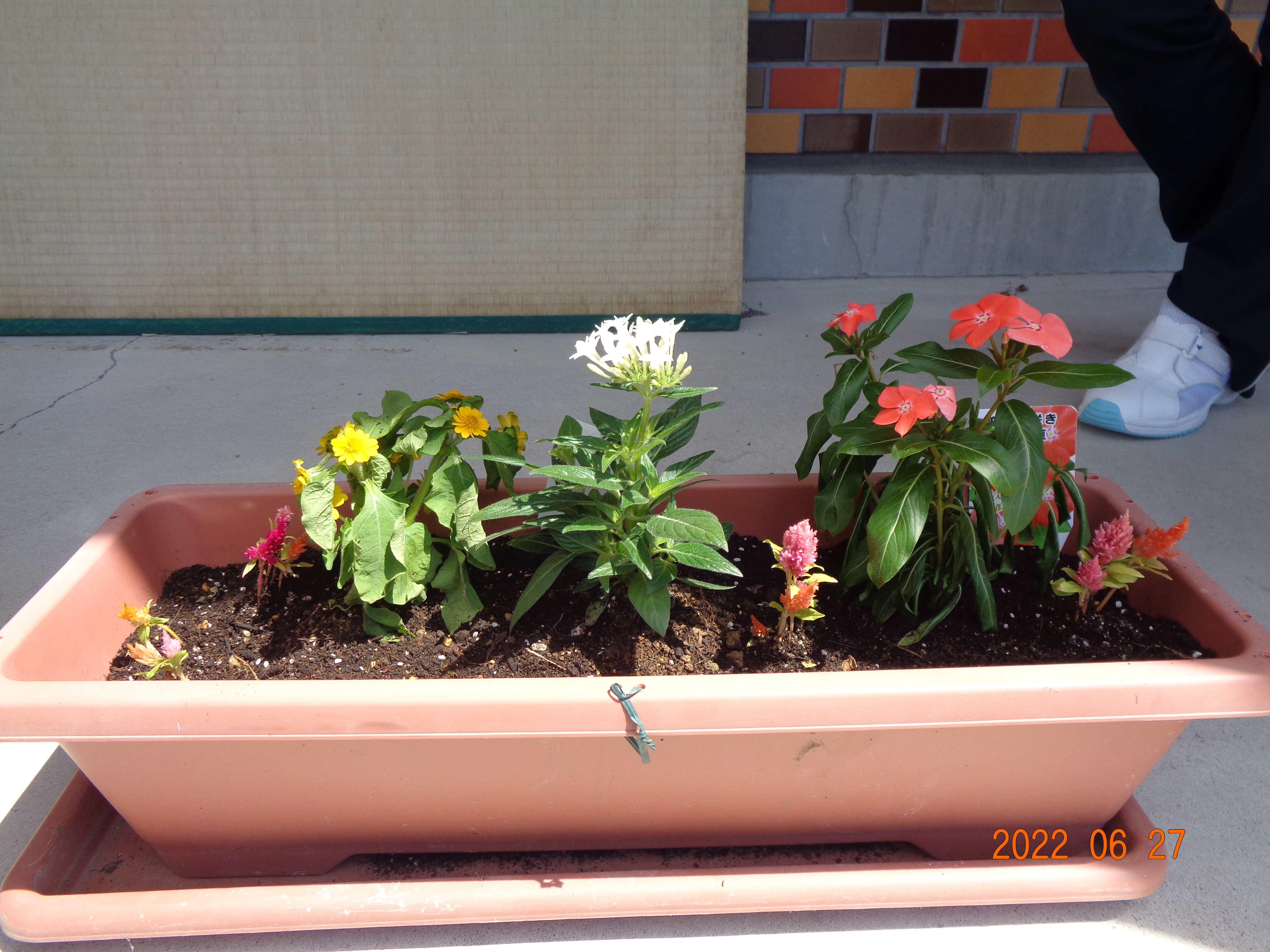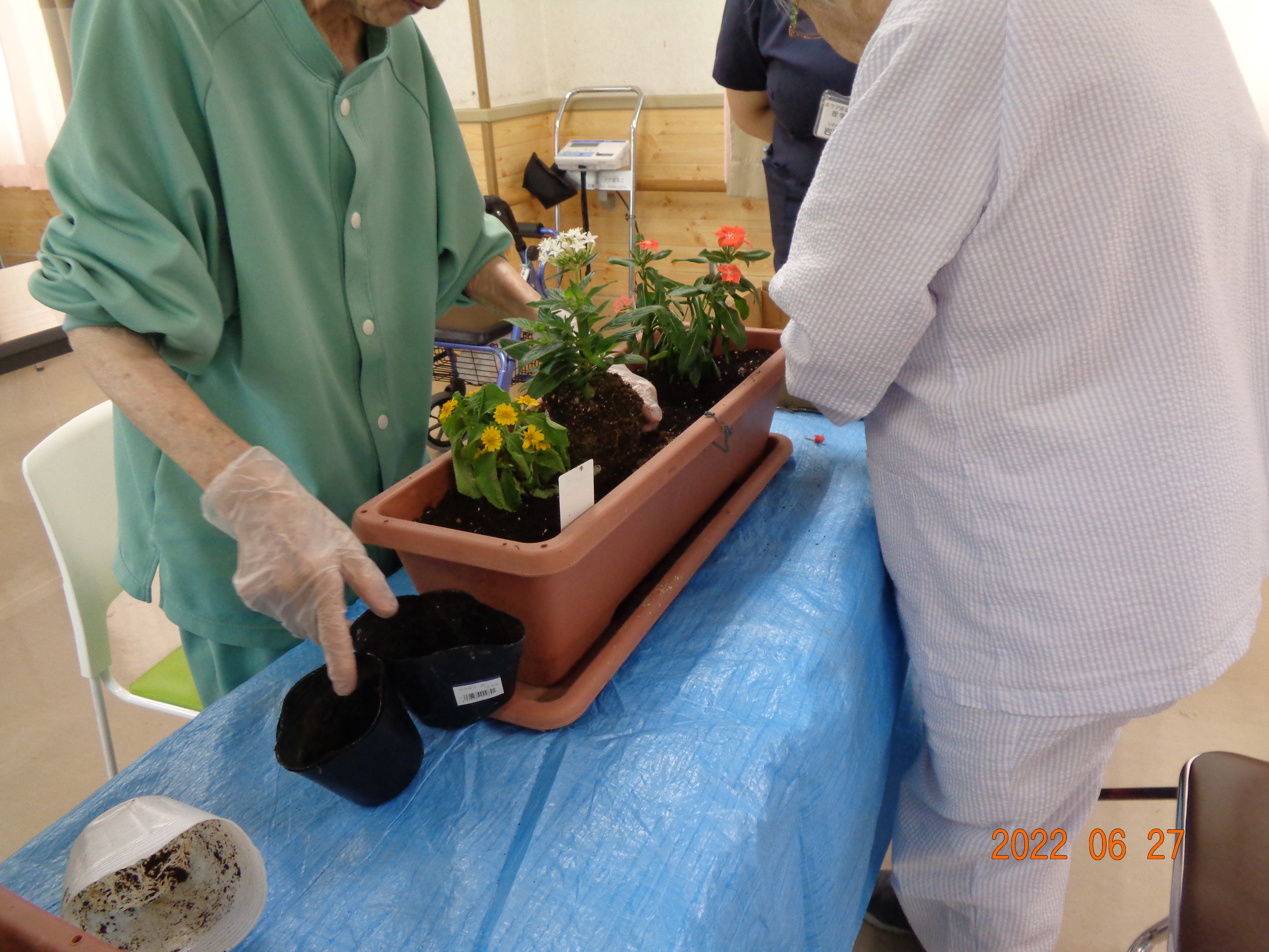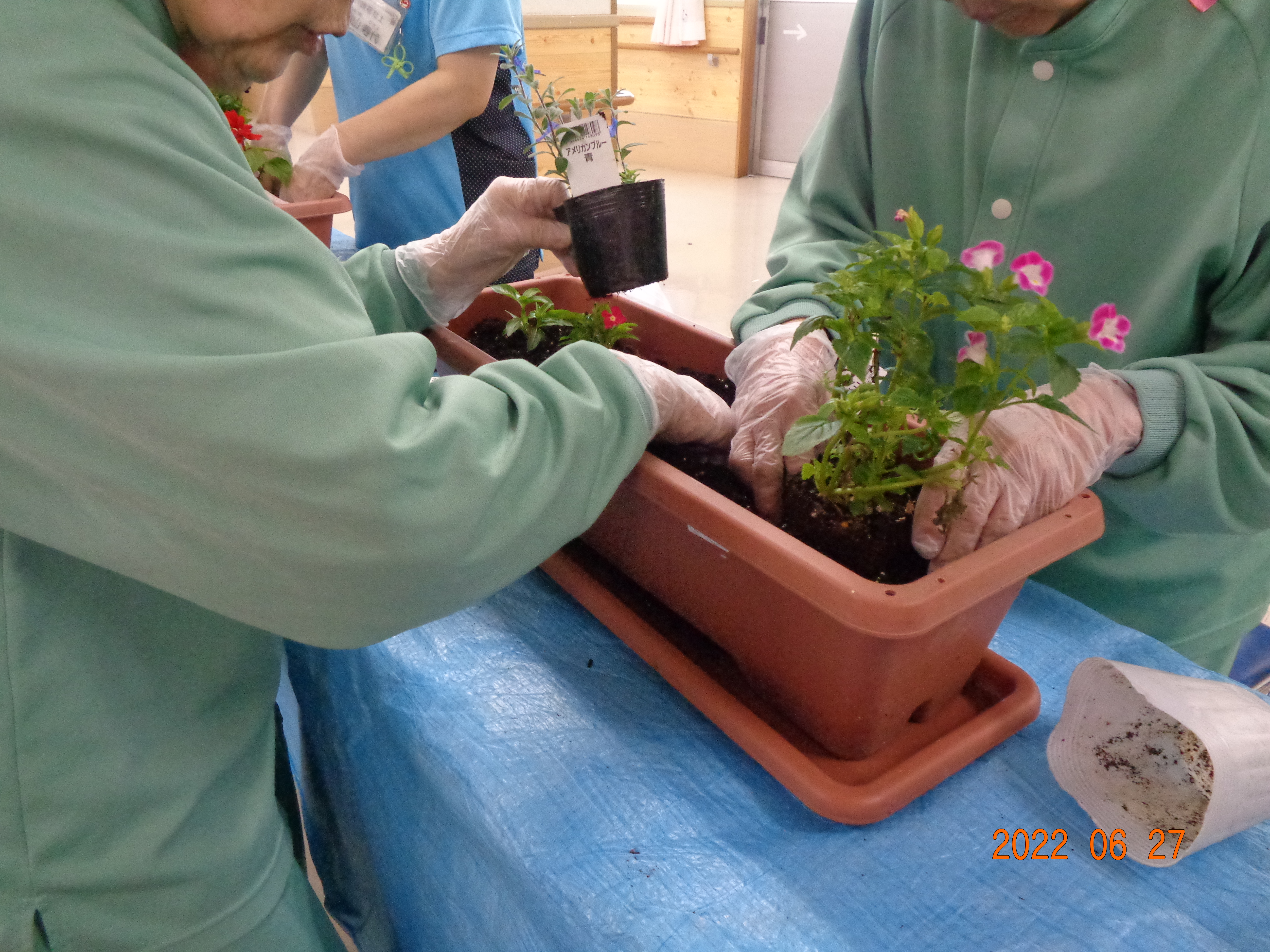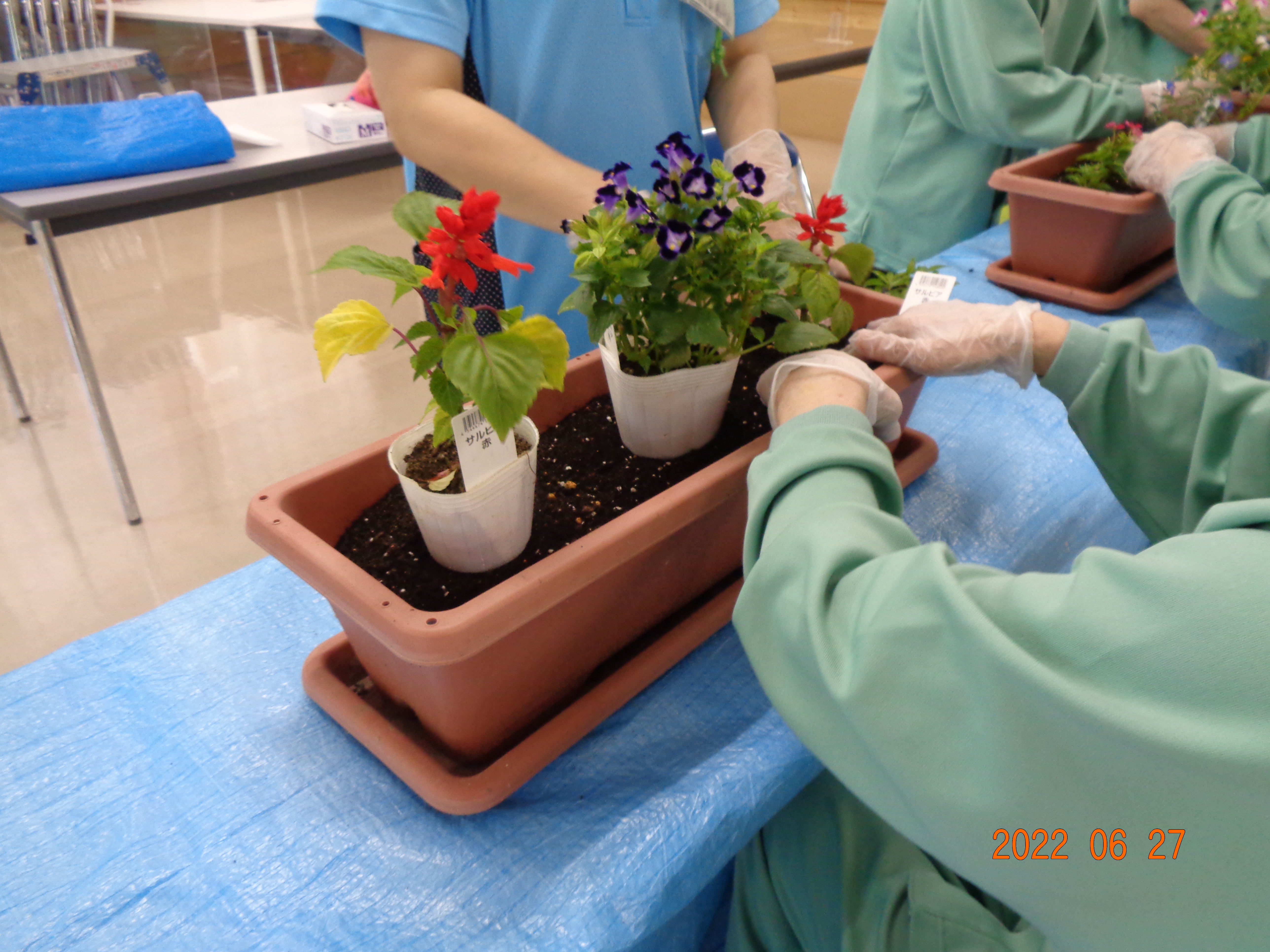 プランターにお花を植えました。利用さんは久しぶりの土いじりは「楽しい」と作業されていました。