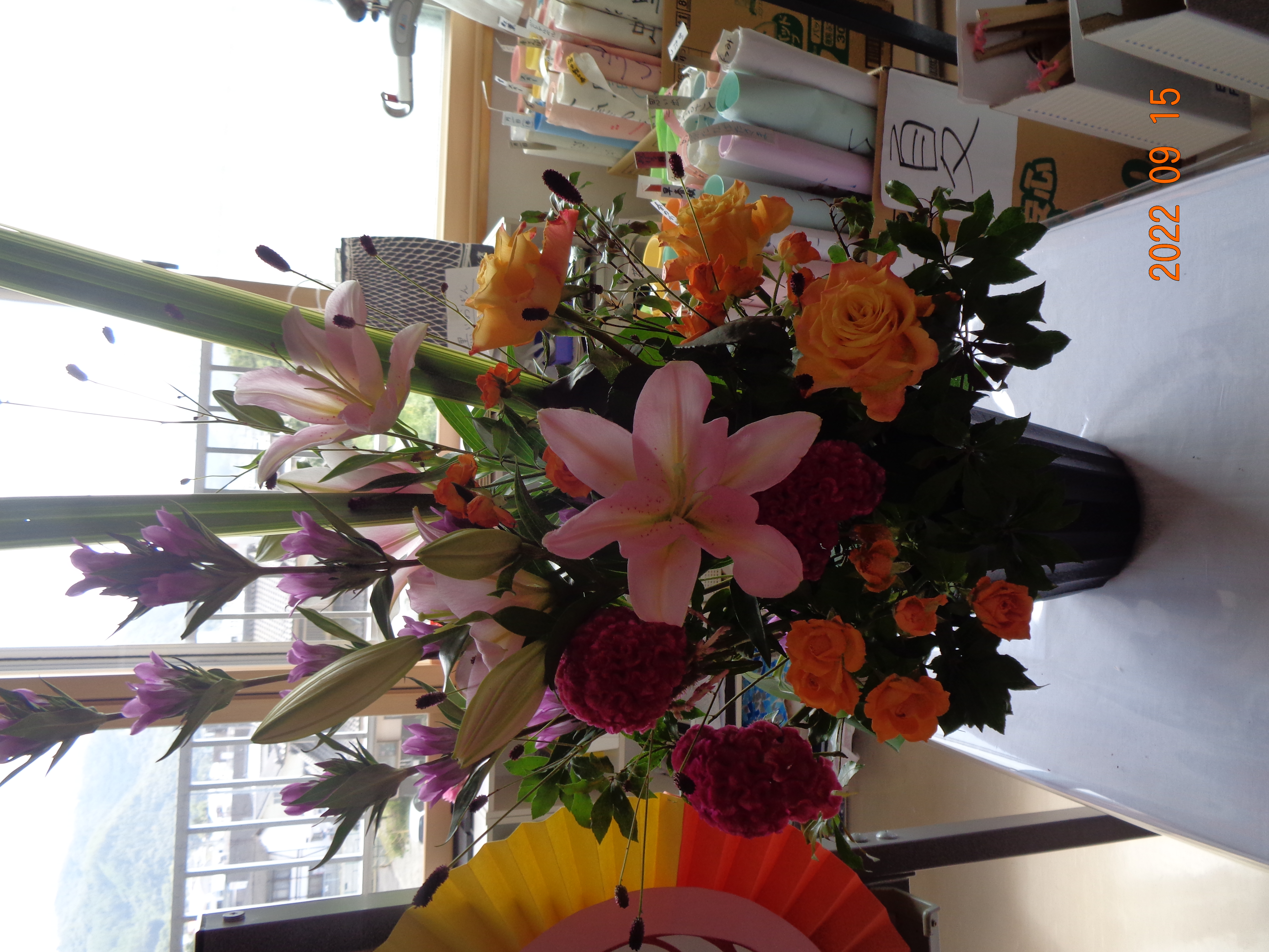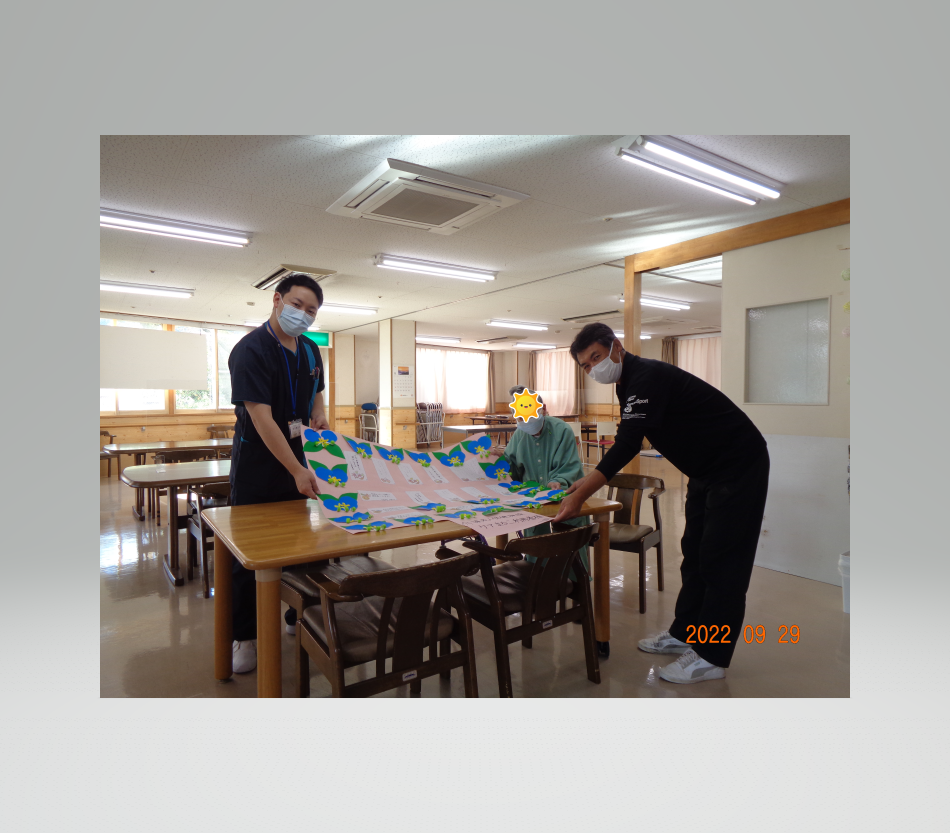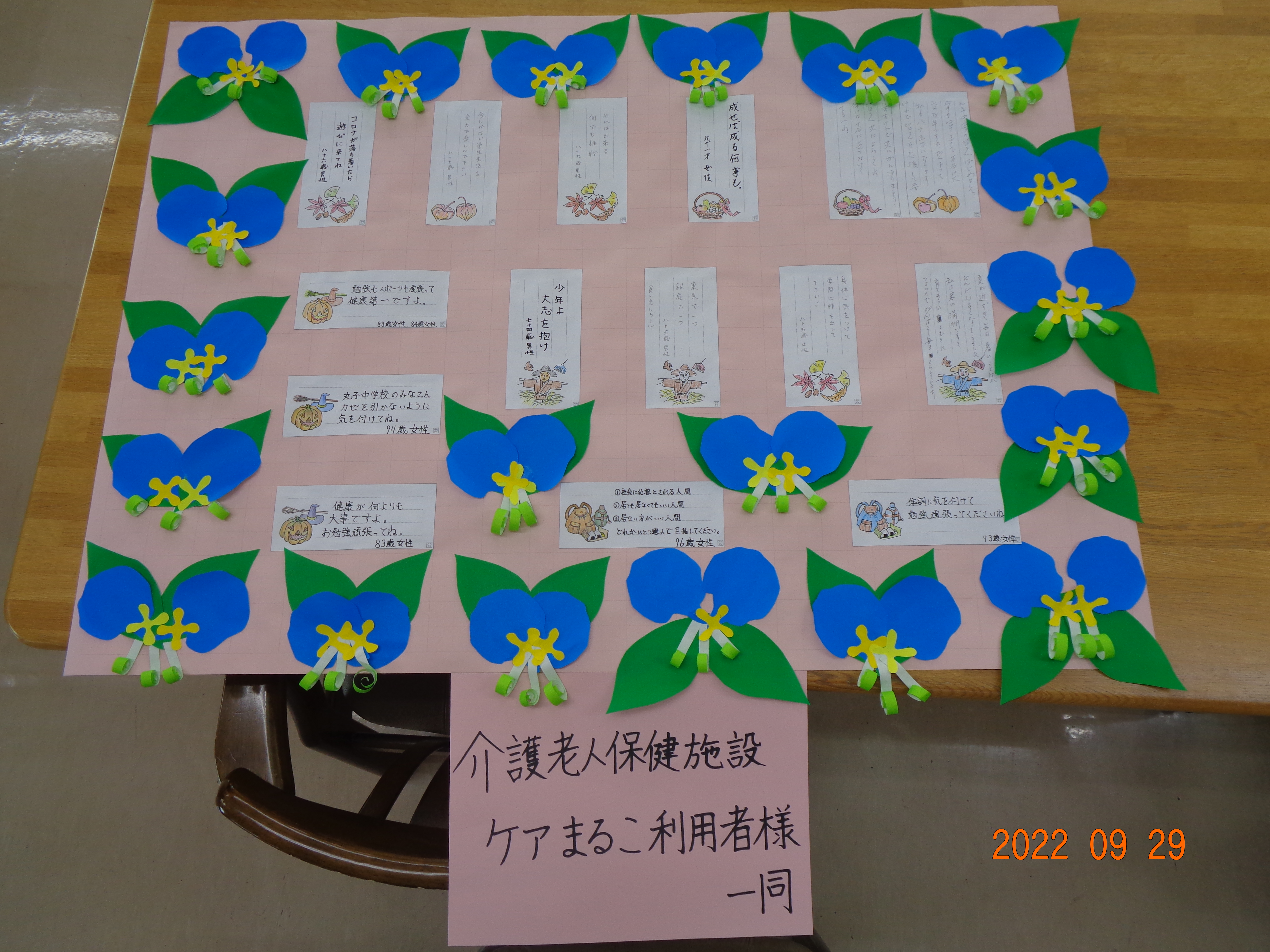 ケアまるこの利用者さんからは文化祭の名前、露草にちなんで折り紙で露草の花を作り寄せ書きをして、中学校にプレゼントさせていただきました。コロナ禍で中学生の皆さんに直接お渡しすることはできませんでしたが、中学校の先生にお渡しすることができました。