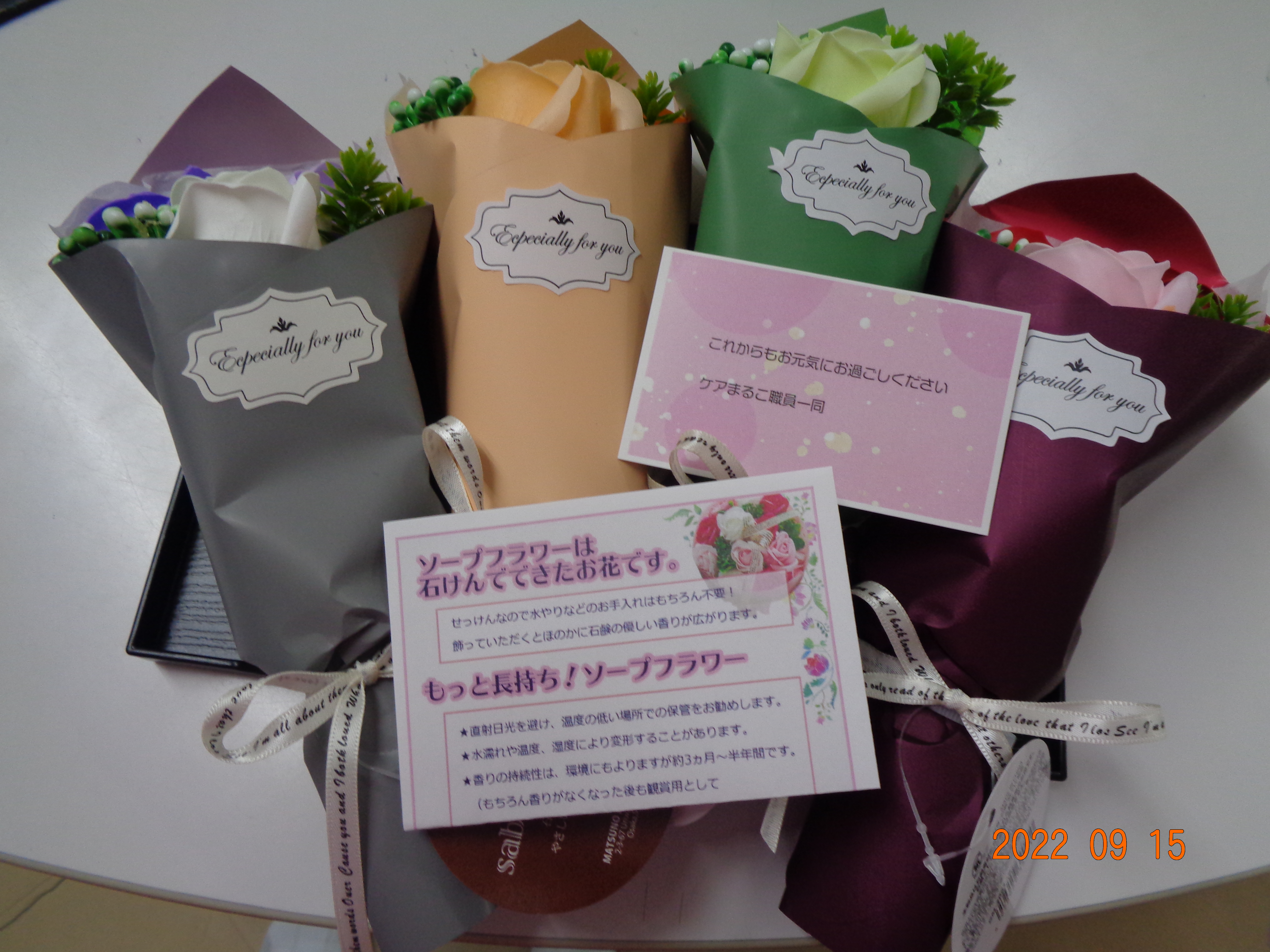 毎年丸子中学校の皆さんが文化祭のイベントでケアまるこ入所者さんへプレゼントをしてくれます。