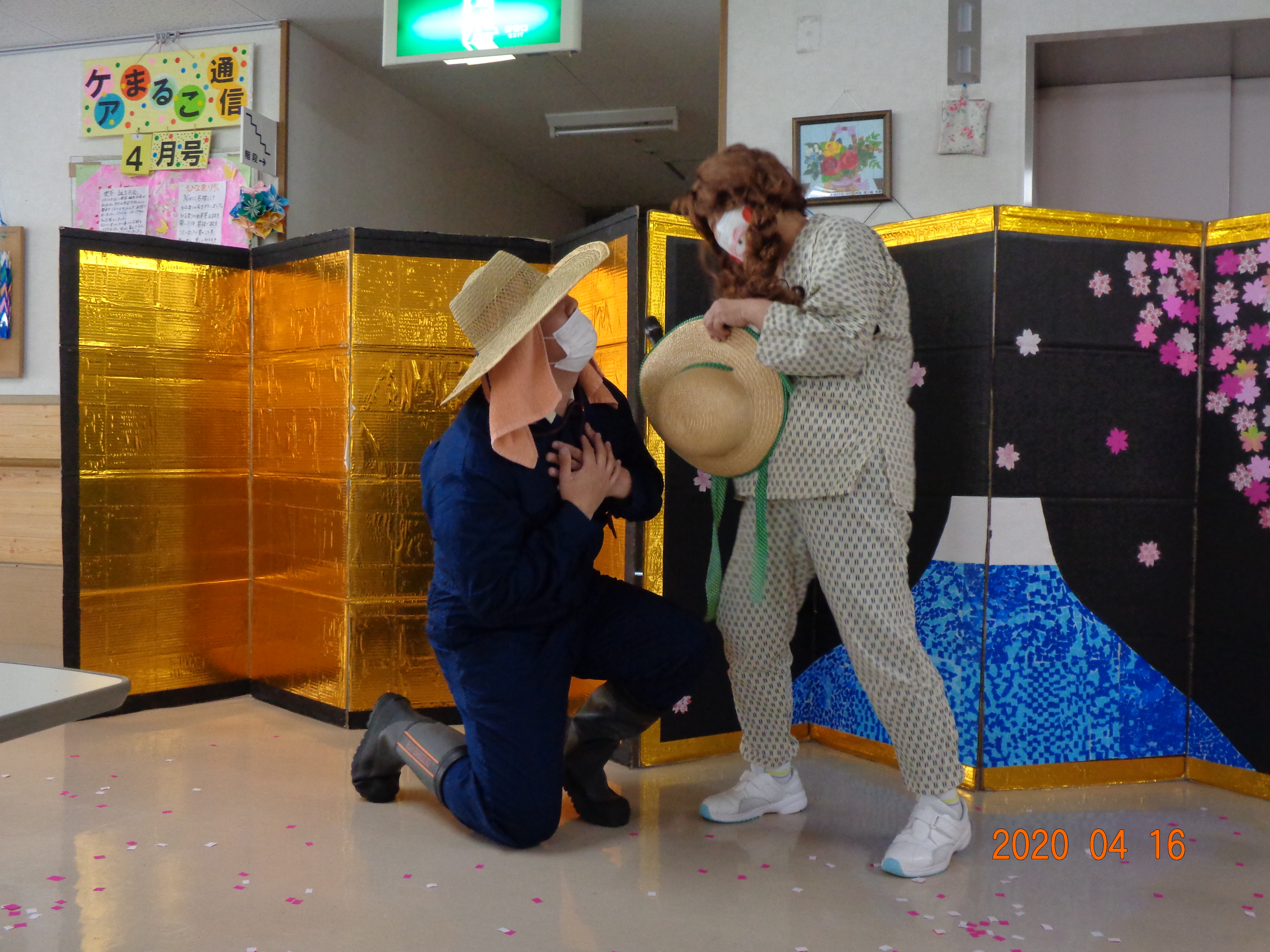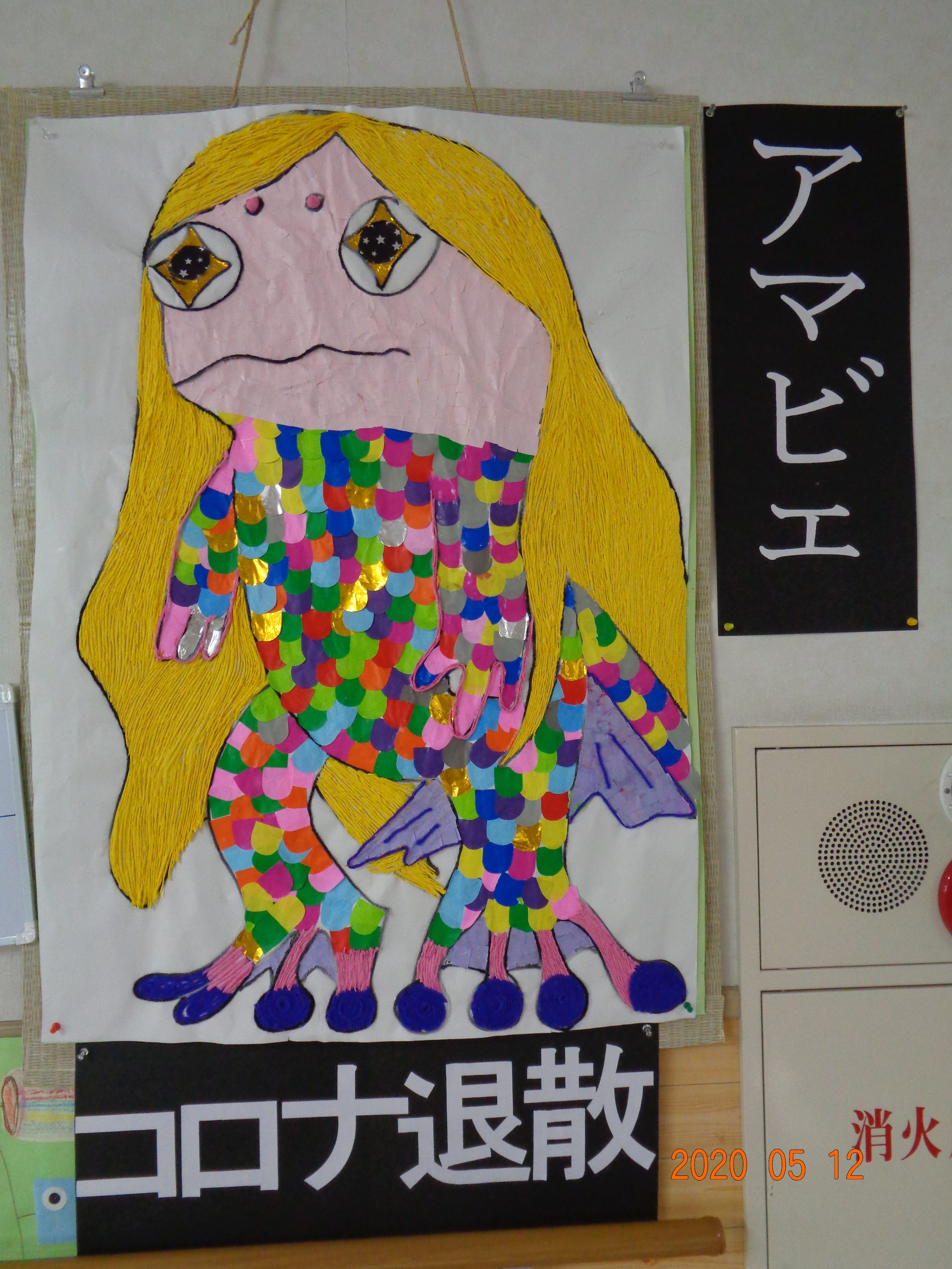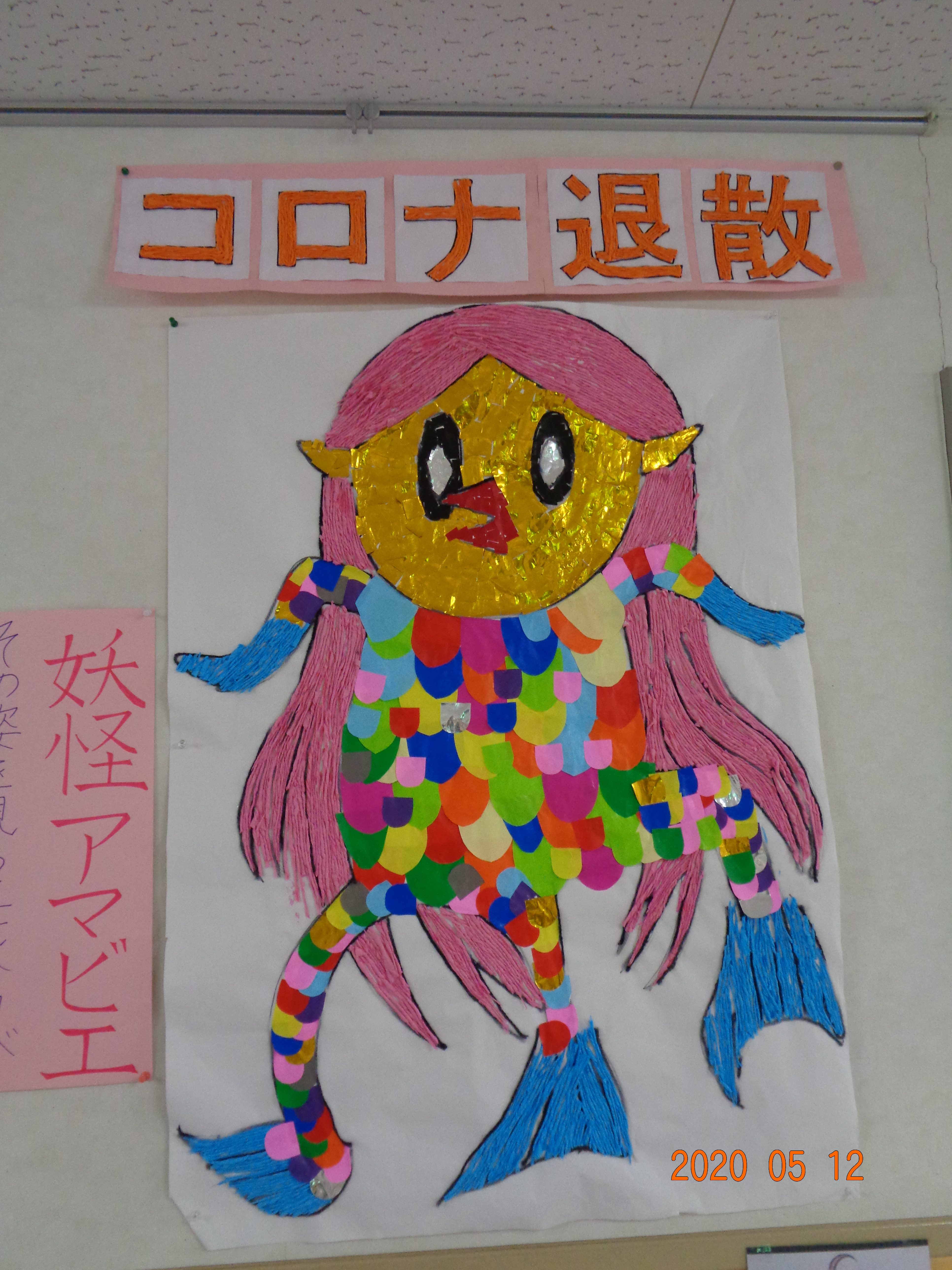 4月のレクレーション制作で『妖怪アマビエ』を貼り絵しました。新型コロナウイルスの早期終息願い利用者さんと職員で制作しました。※妖怪アマビエを見ると疫病が鎮まると言い伝えられています。