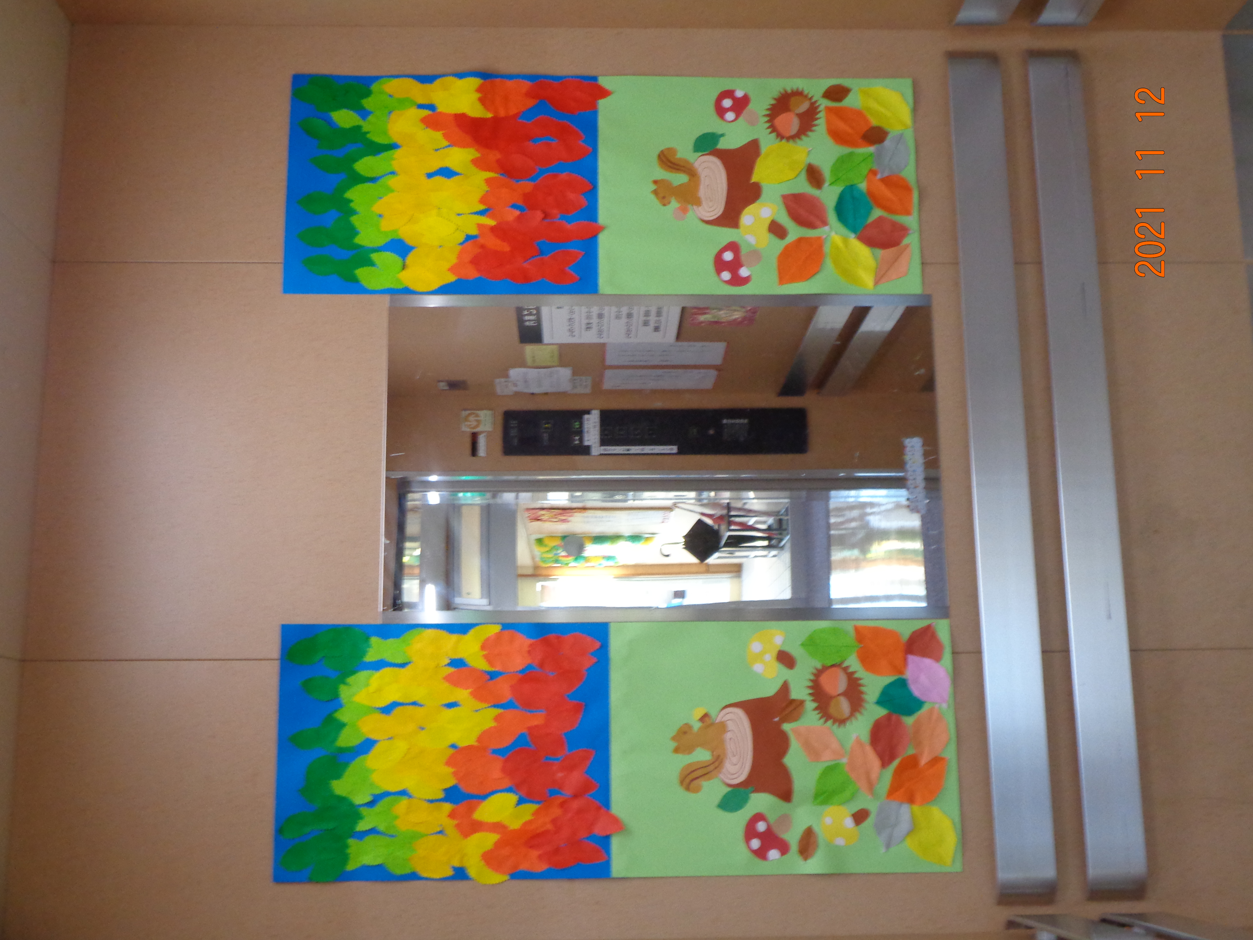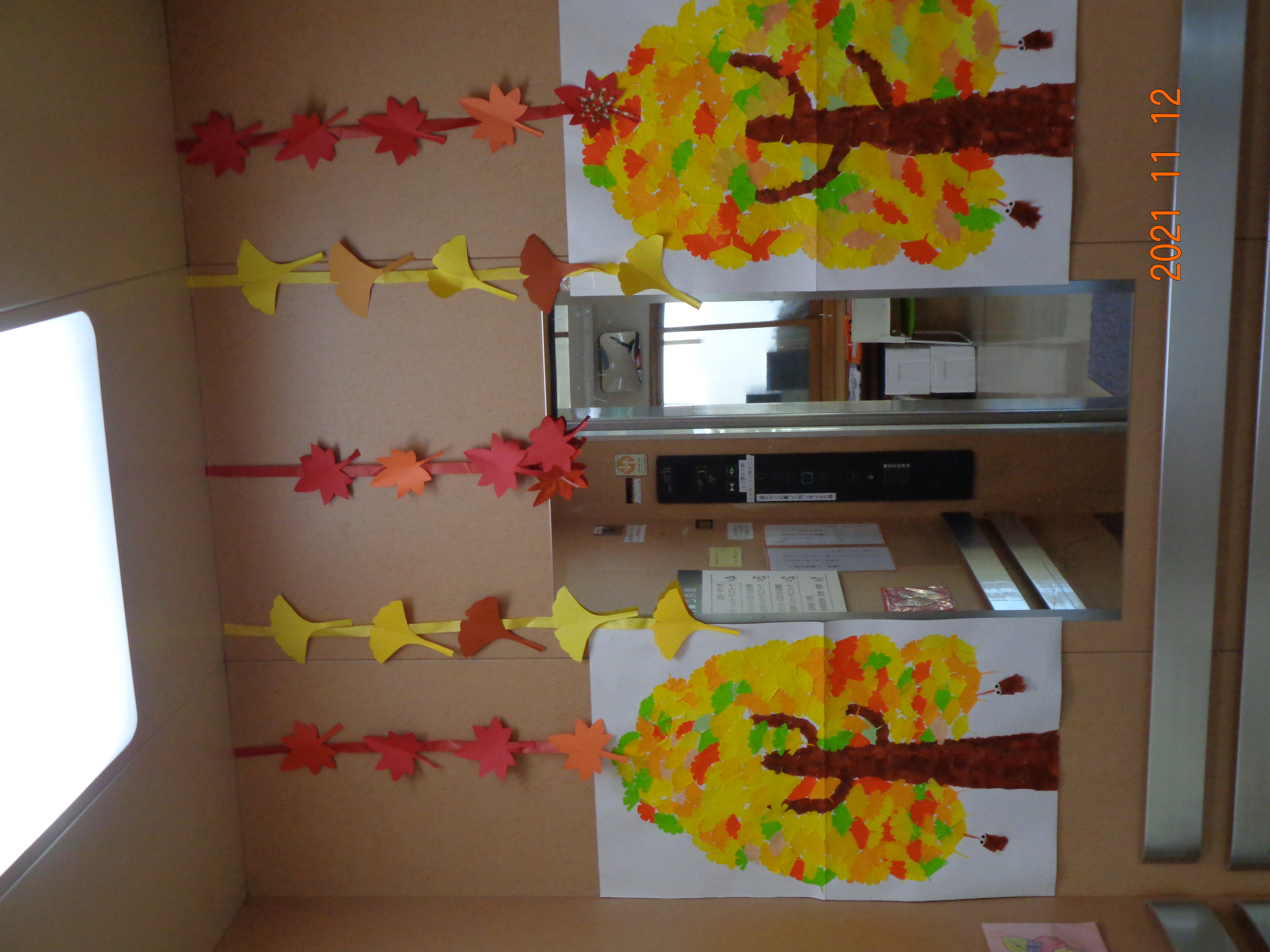 エレベーターの飾りも変わりました。かごの中は利用者さんが制作しました。