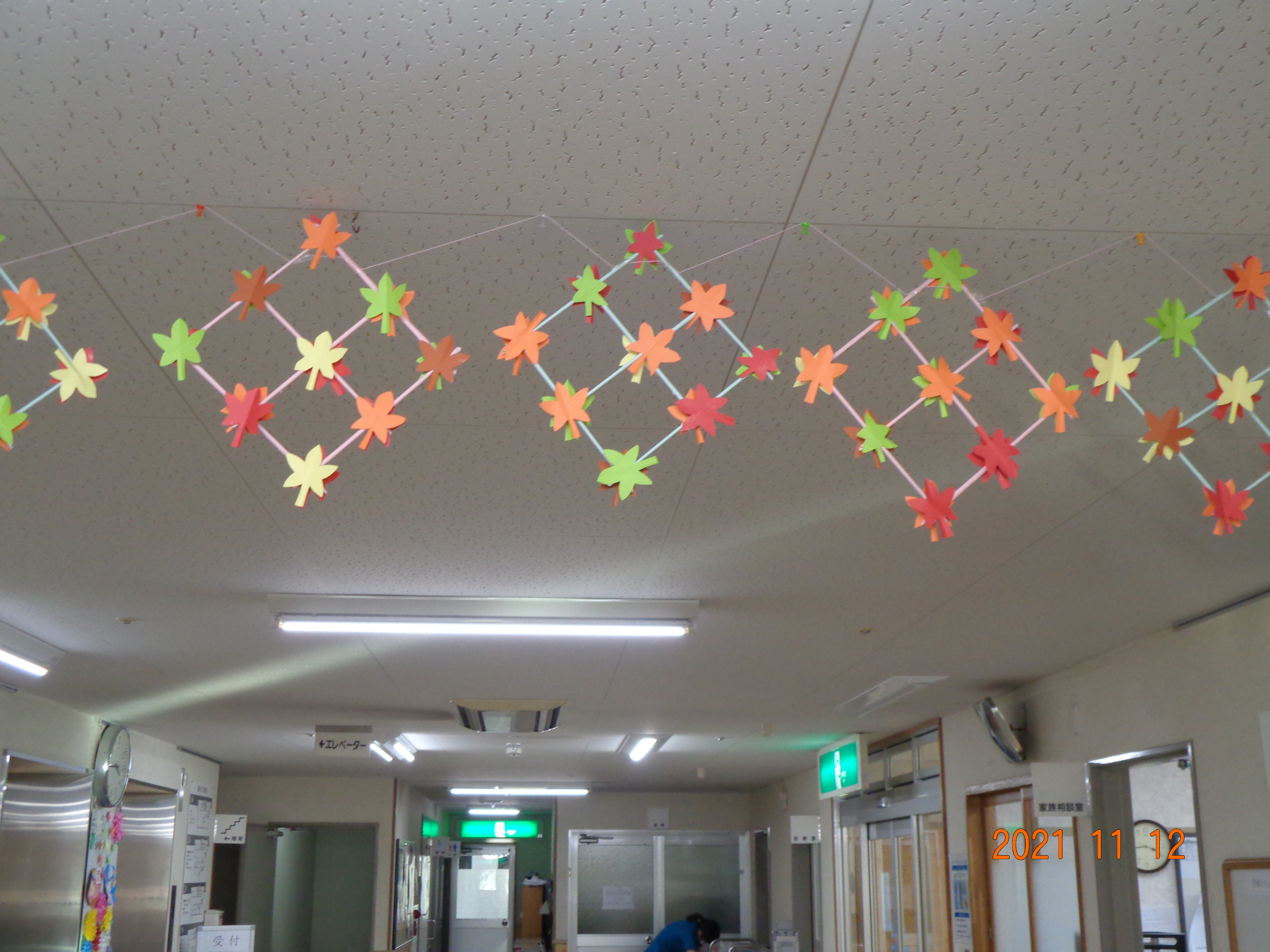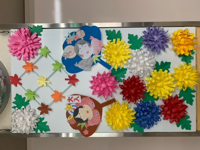 エレベーター前の飾りは作業療法士が綺麗な菊を作りました。