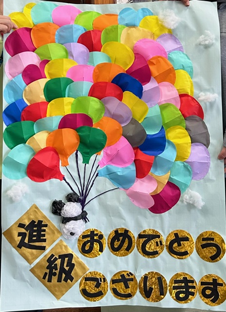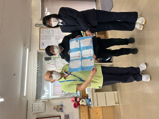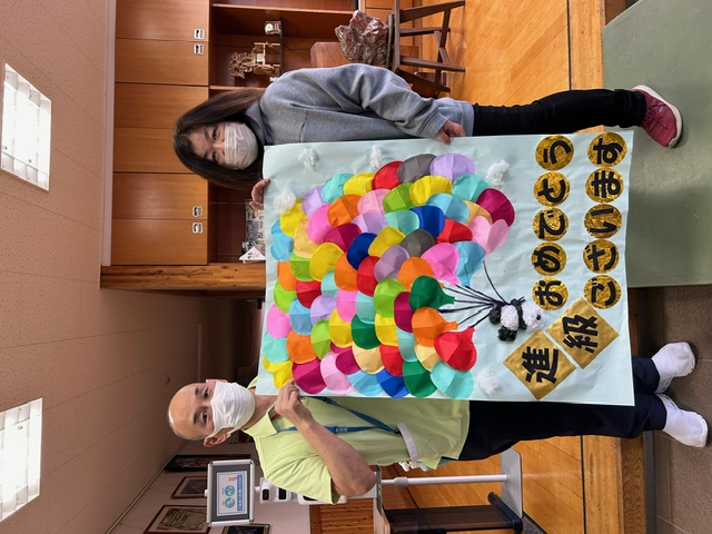 今年もケアまるこ利用者さんと職員で丸子中学校の皆さんに進級祝いの壁飾りを作り、総師長が代表で丸子中学校に届けました。